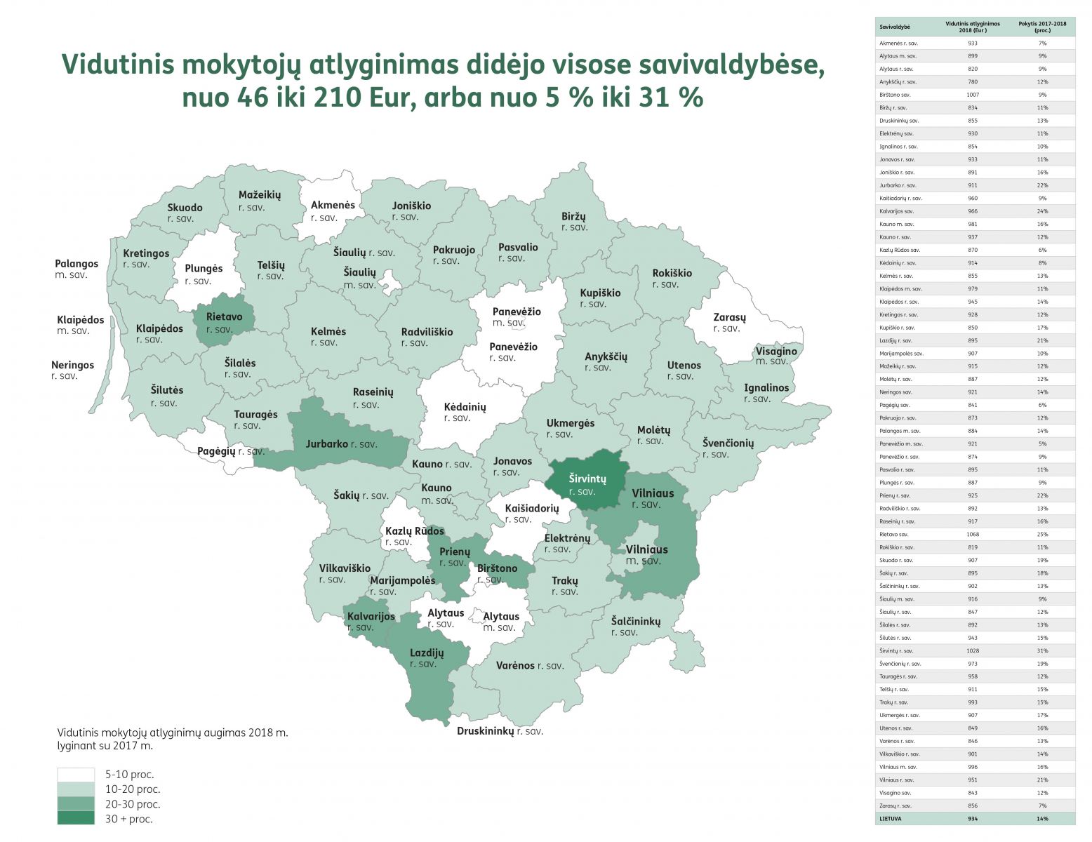 Atlyginimų augimas, pasak ŠMM, fiksuojamas tiek mieste, tiek kaime. Skirtingose savivaldybėse bendrojo ugdymo mokyklų mokytojų atlyginimai didėjo nuo 5 proc. iki 31 proc. Kauno ir Vilniaus mokytojams atlyginimai padidėjo 16 proc., Klaipėdos – 11 proc., Šiaulių – 9 proc., Panevėžio – 5 proc. Didžiausi mokytojų atlyginimų kilimo šuoliai fiksuojami Širvintų rajone – 31 proc., Rietavo savivaldybėje – 25 proc., Kalvarijos savivaldybėje – 24 proc., Jurbarko, Prienų r. – 22 proc., Vilniaus rajono – 21 proc.