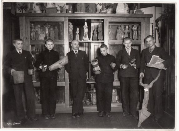 Panevėžio muziejaus vedėjas (1934–1941 m.) Antanas Kasperavičius su senienų rinkėjais prie eksponatų. J. Žitkaus nuotrauka.