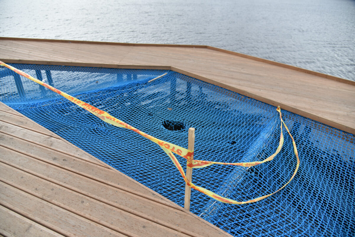„To tinklo paskirtis – poilsinė zona virš vandens. Jis skirtas gulėti, bet žmonės ant jo šokinėja kaip ant batuto. Natūralu, kad didelis skirtumas, koks poveikis medžiagai šokinėjant ir ramiai ant jos gulint. Tikriausiai dėl to kai kurie plyšimai ir atsirado. Prie visų trijų įėjimų į terasą įrengti informaciniai stendai, kaip elgtis, kas galima, ko ne, bet, kaip matome, tas ne visada padeda“, – teigė T. Stanikūnas.