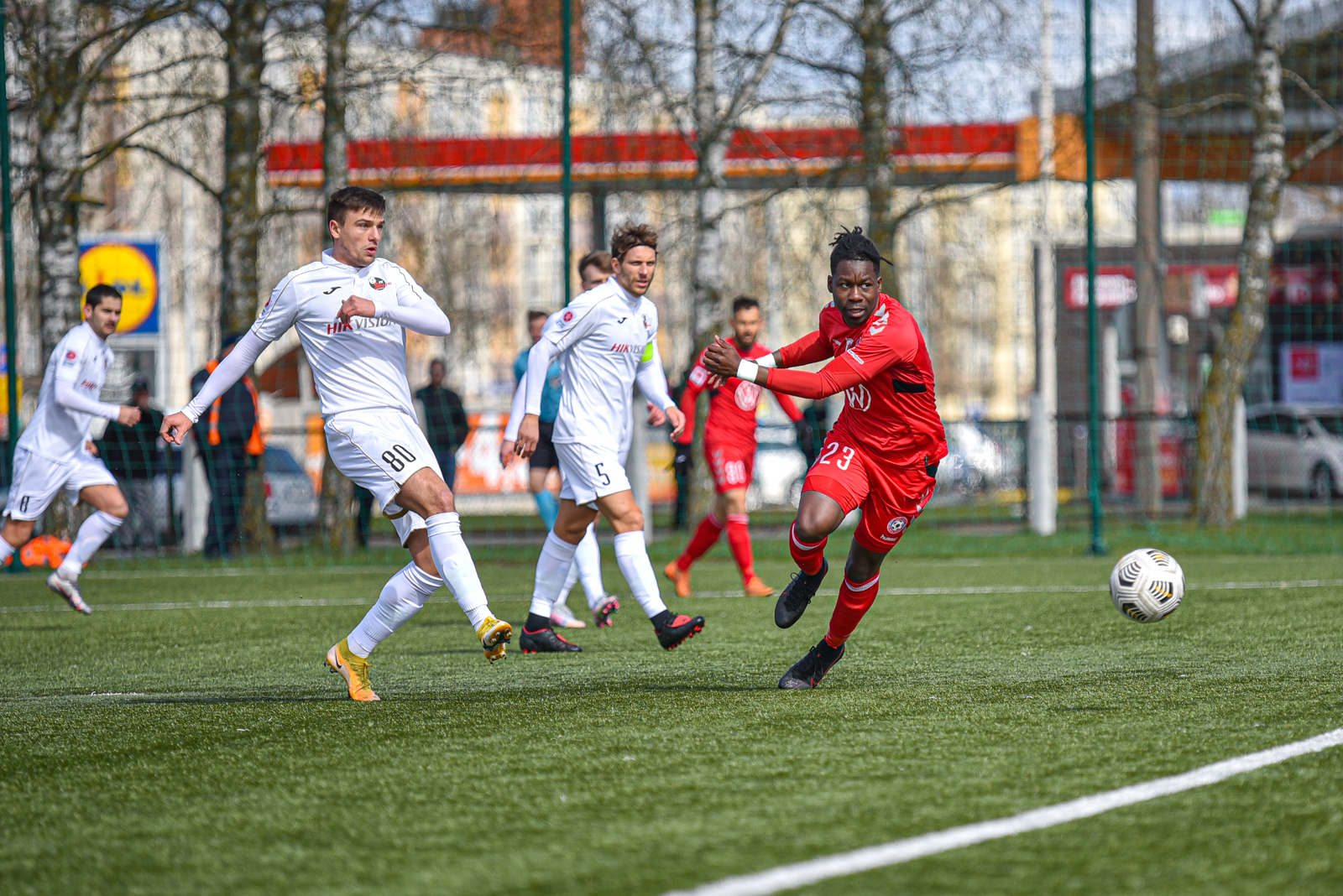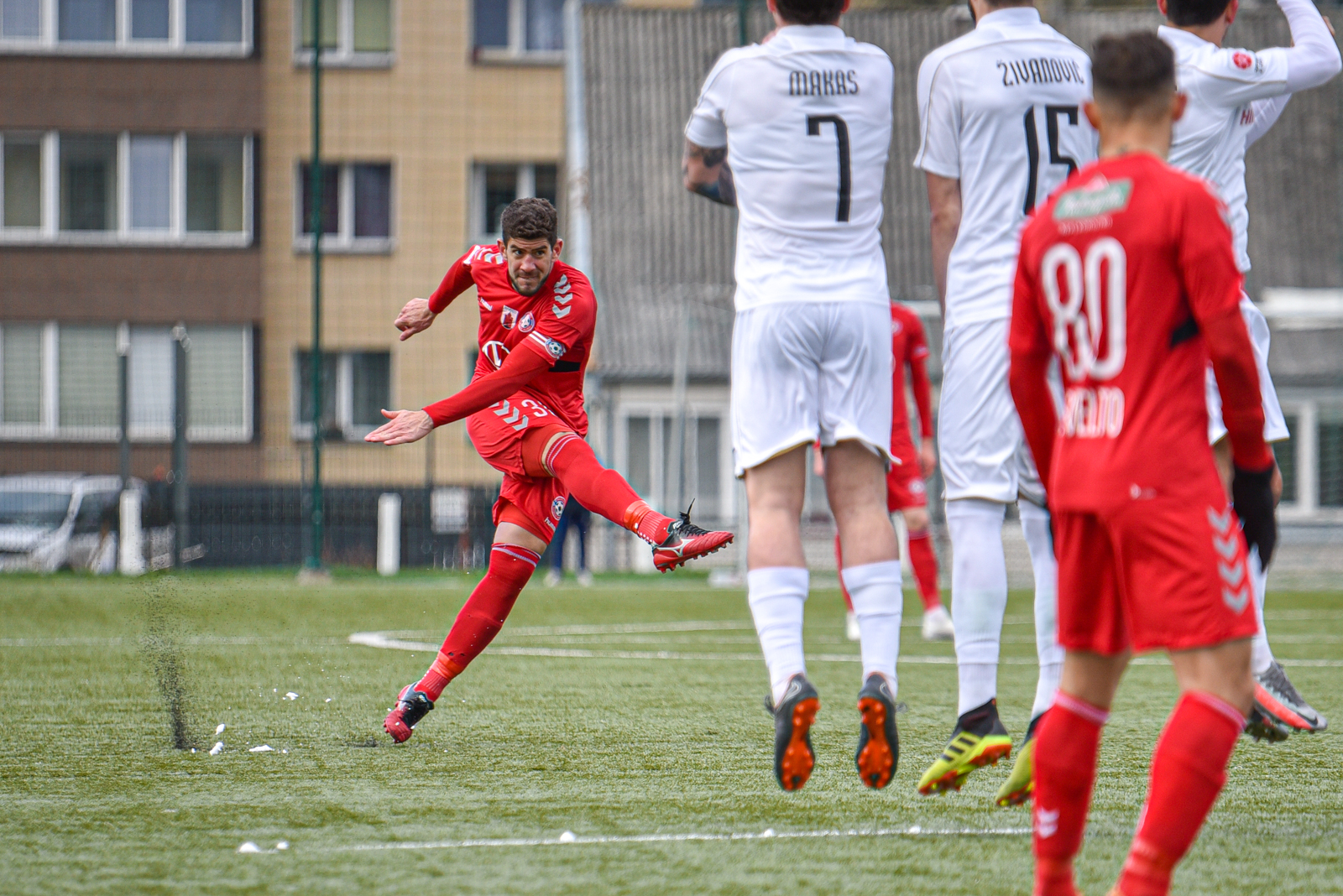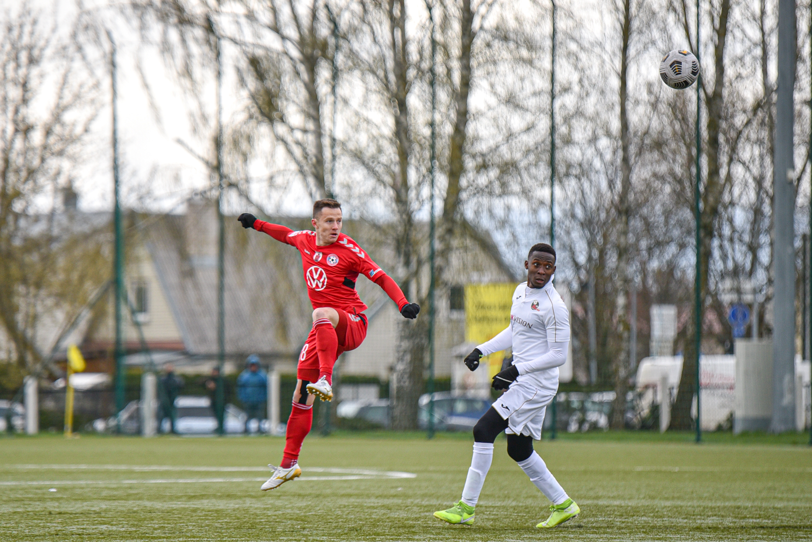 Visgi pirmieji pavojingiausią epizodą sukūrė šeimininkai – 37-ąją minutę Sebastianas Vasquezas smūgiu iš baudos aikštelės prieigų sudrebino marijampoliečių vartų konstrukciją. Po atkaklaus pirmojo kėlinio vyravo lygybė – 0:0.