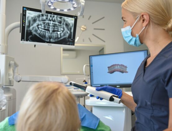 Pirmojo vizito metu paciento dantys nuskenuojami intraoraliniu skeneriu.