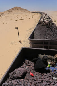 Traukinys šįsyk pajuda švelniau, mat kiekvienas vagonas pakrautas 80 tonų geležies rūdos. Ožkaganiai sparčiai ruošia savo buveinę 16 valandų kelionei – sulygina geležies rūdos skaldą, pasikloja paklodes ir parengia vietą laužui. Keliolika vagonų priešais mane yra pilni ožkų. Kas antrame jų sėdi žmogus ir akylai stebi, kad gyvūnai neiškristų iš traukinio. Kas kartą, kai viena iš ožkų pavojingai priartėja prie vagono krašto, piemuo sviedžia akmenį ir taip bando nubaidyti ją į vidurį. Tačiau gyvuliai vis tiek kartais iškrenta. „Per kiekvieną kelionę neišvengiamai prarandame po keletą ožkų. Kartais jas pavyksta pagauti, kartais jos žūsta dykumoje, o kartais jas pasisavina klajoklių gentys ar netolimų kaimų gyventojai“, – pasakoja man Osmanas, aukštas, galingo sudėjimo senegalietis, jau daugelį metų gyvenantis Mauritanijoje.