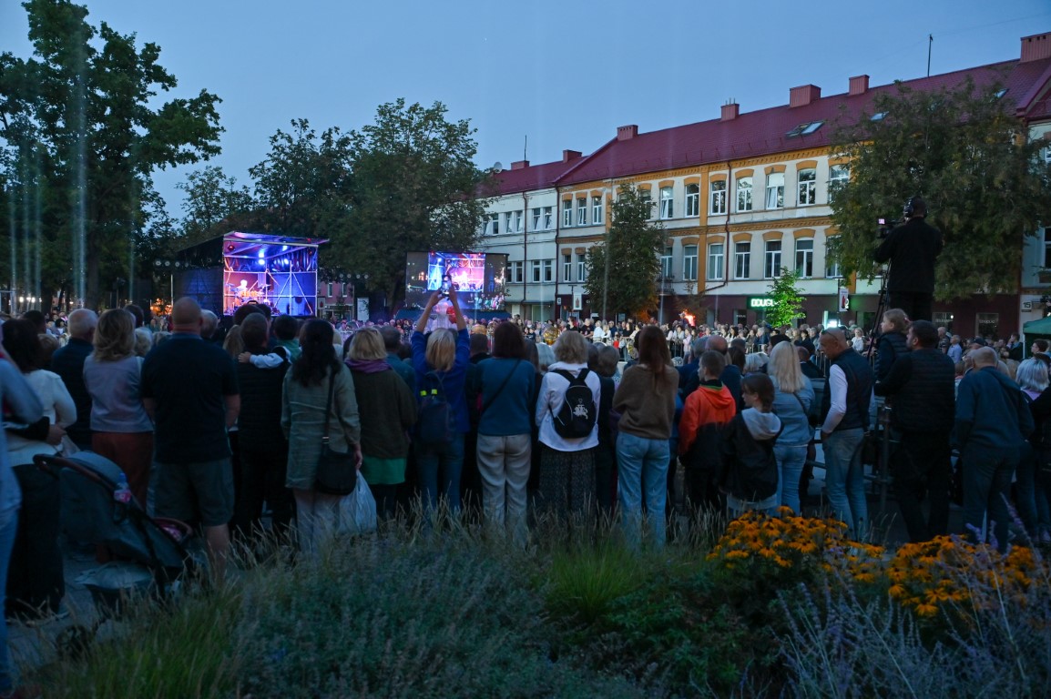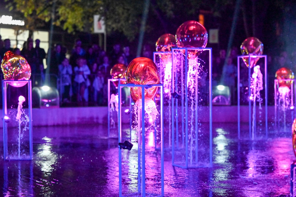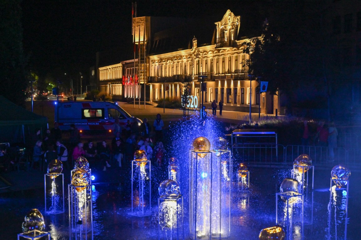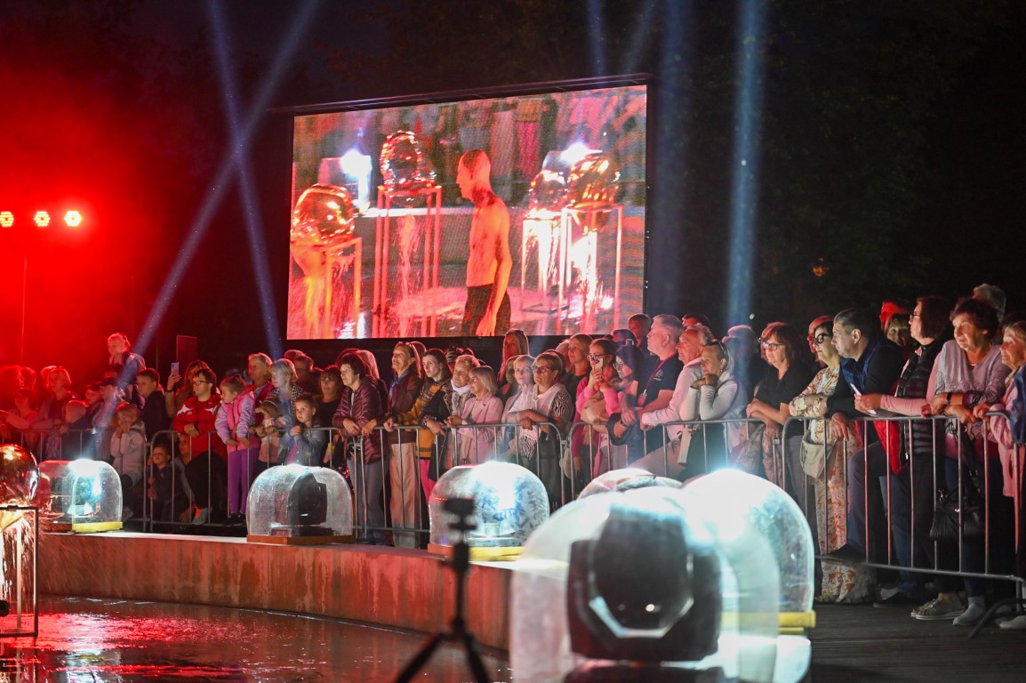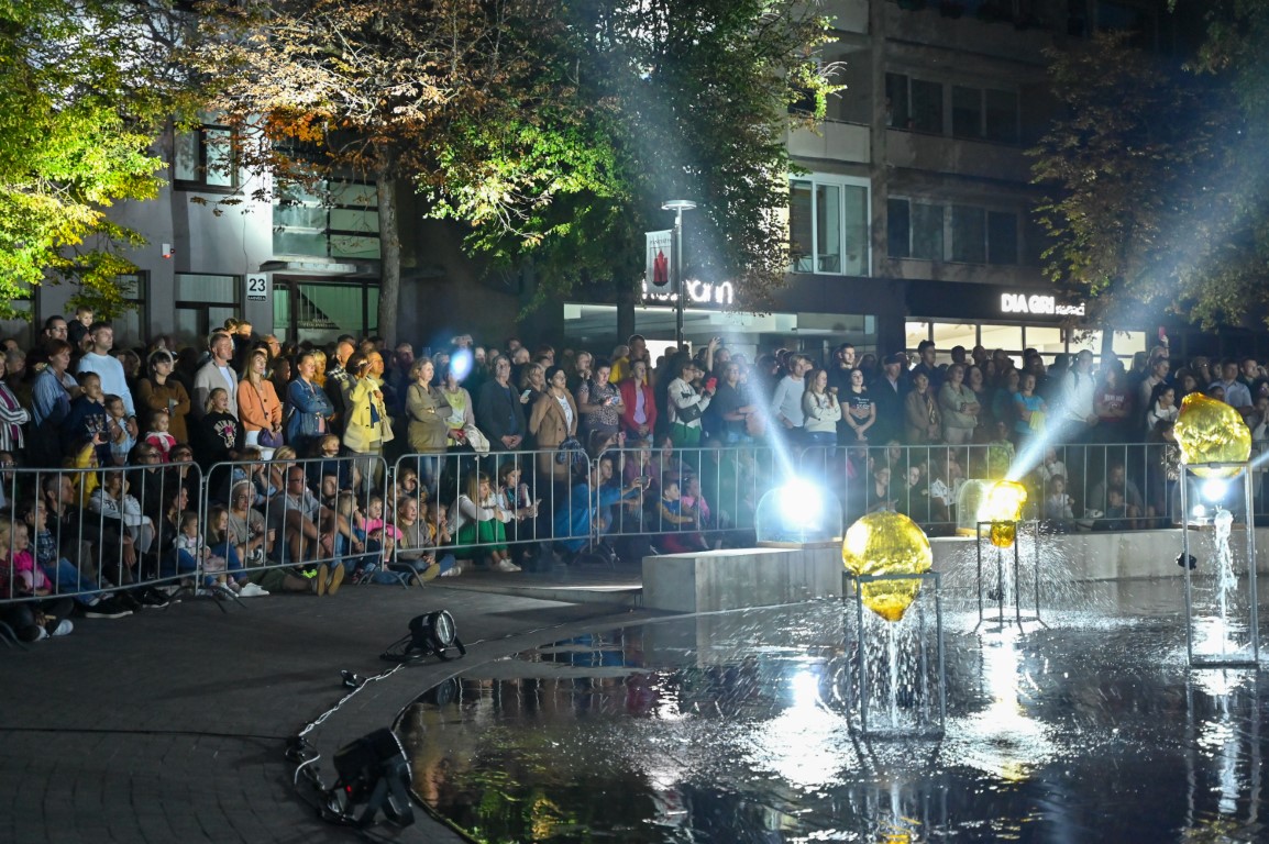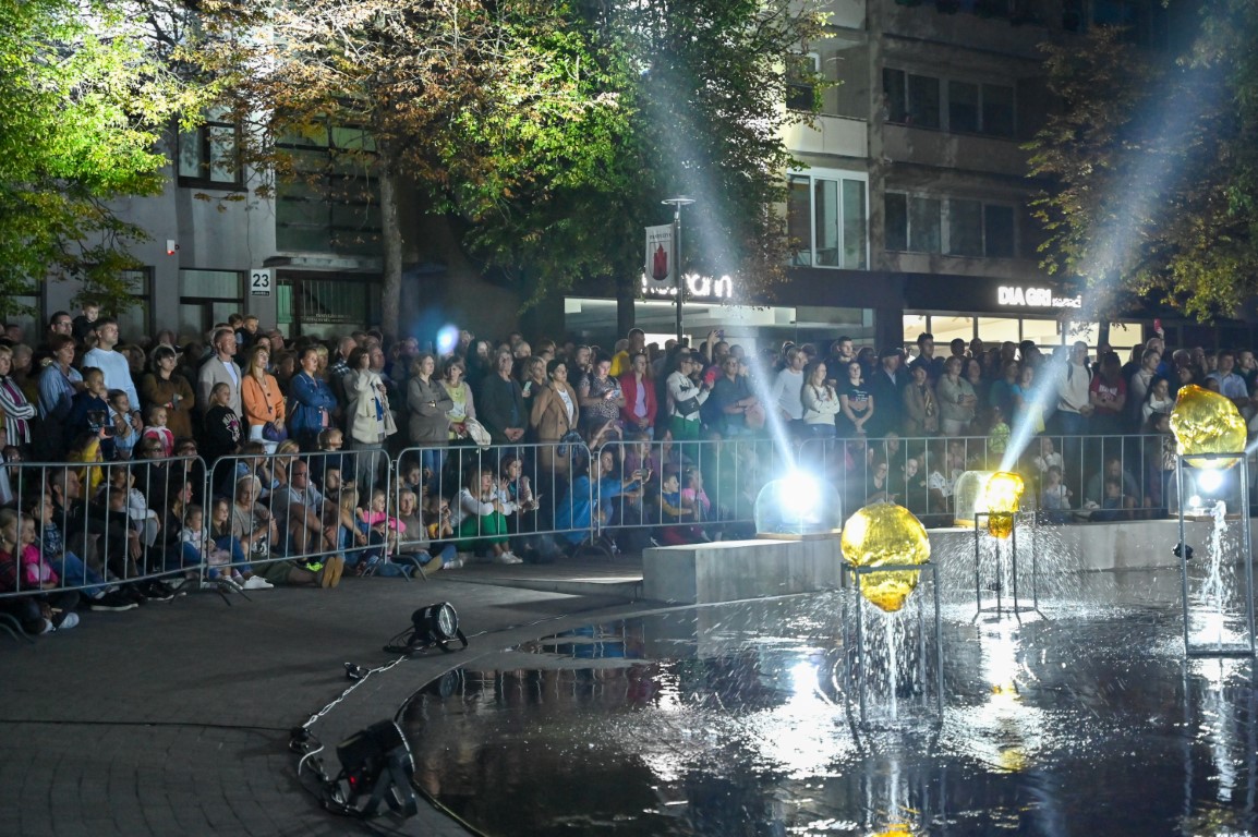 Netilpusieji prie aikštės fontano, tapusio scena menininkams, unikalų ir vienetinį pasirodymą, stebėjo tiesiogiai transliuojamą LED ekranuose.