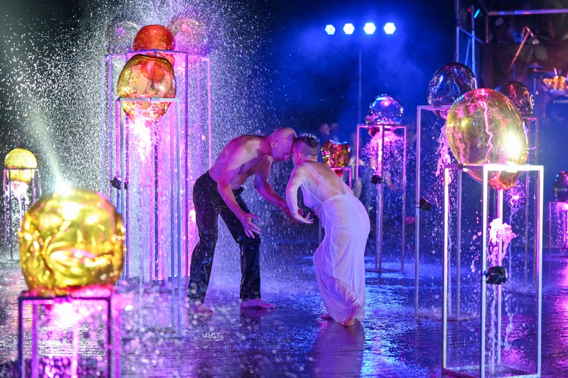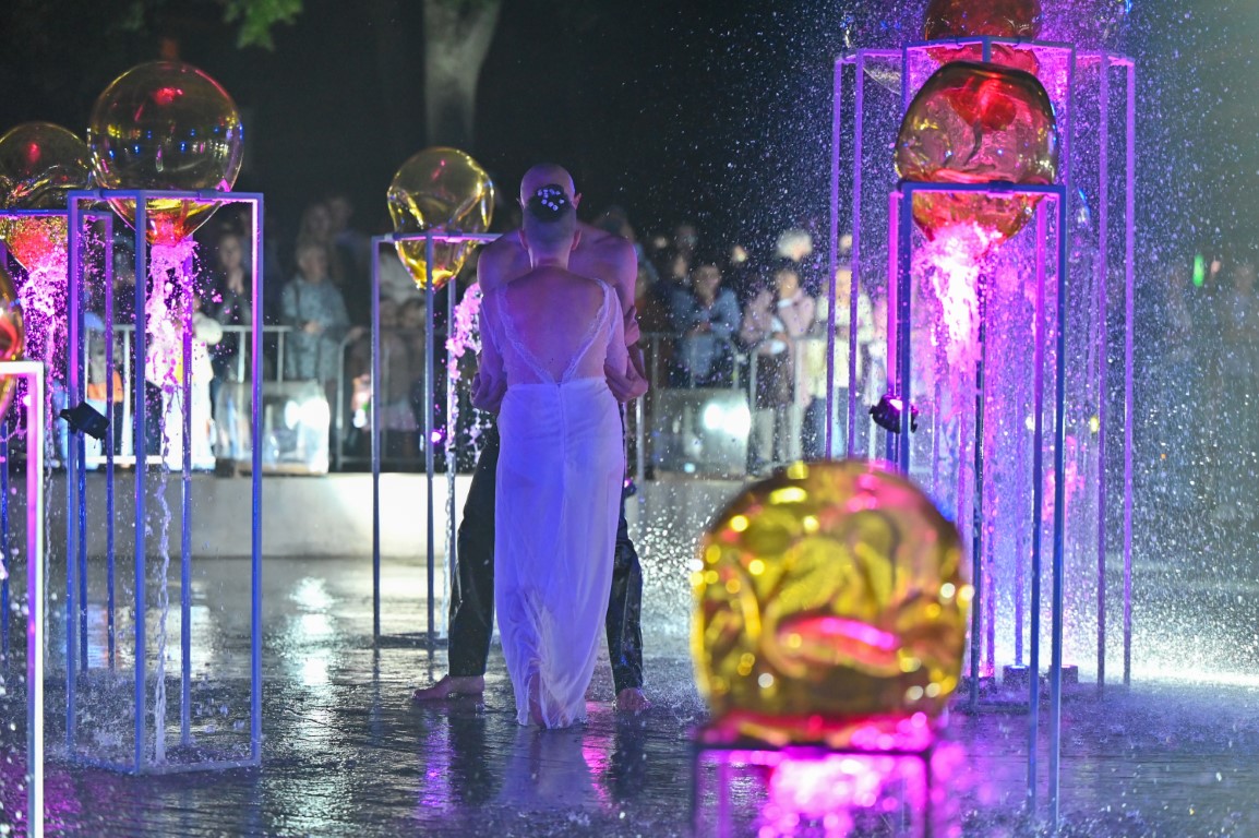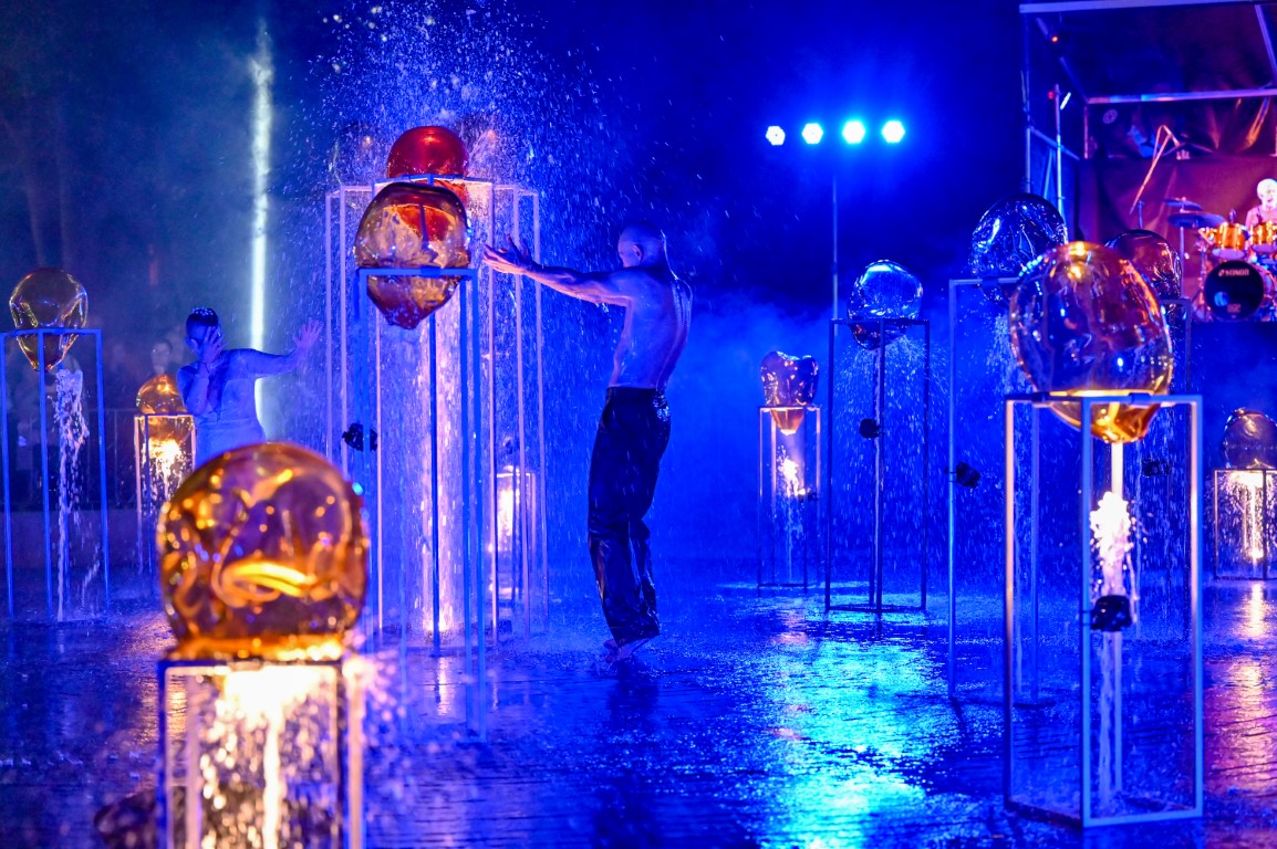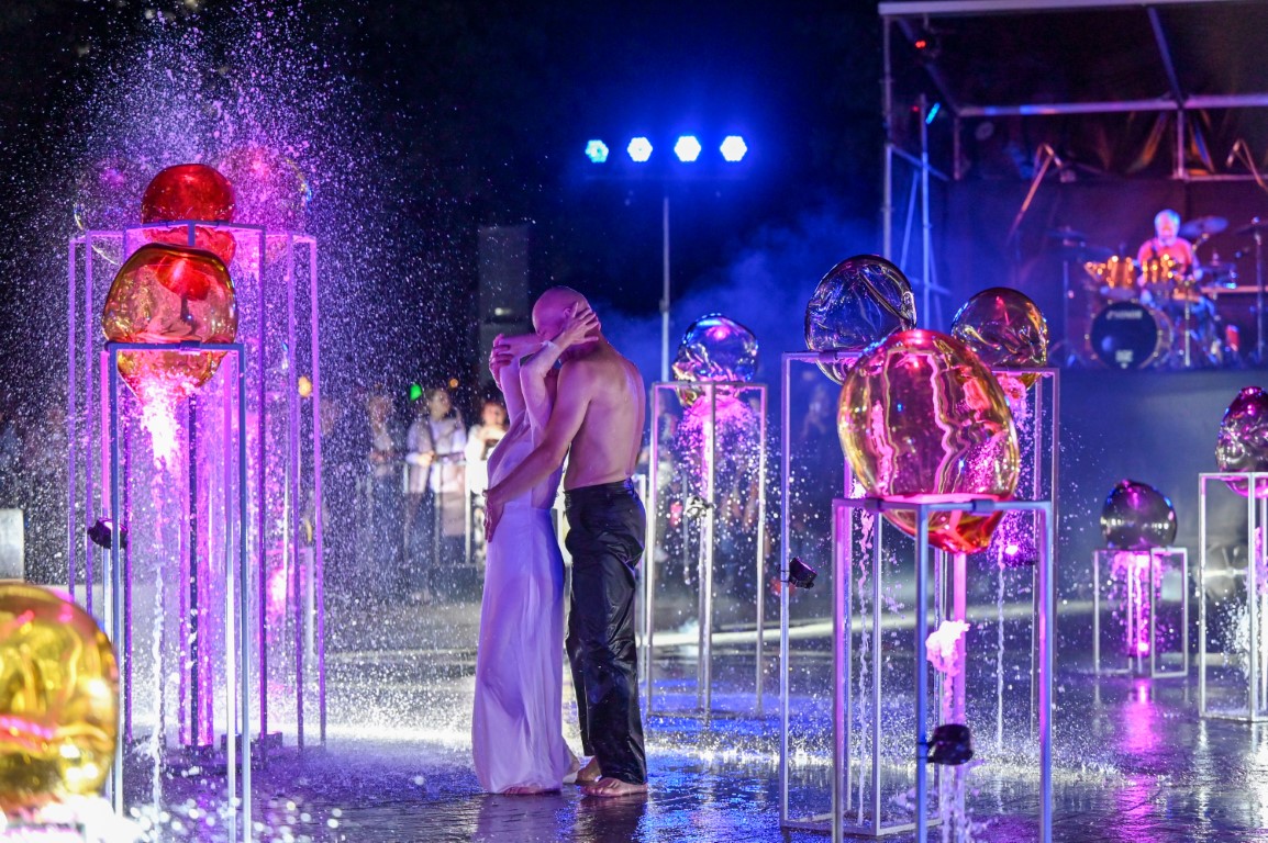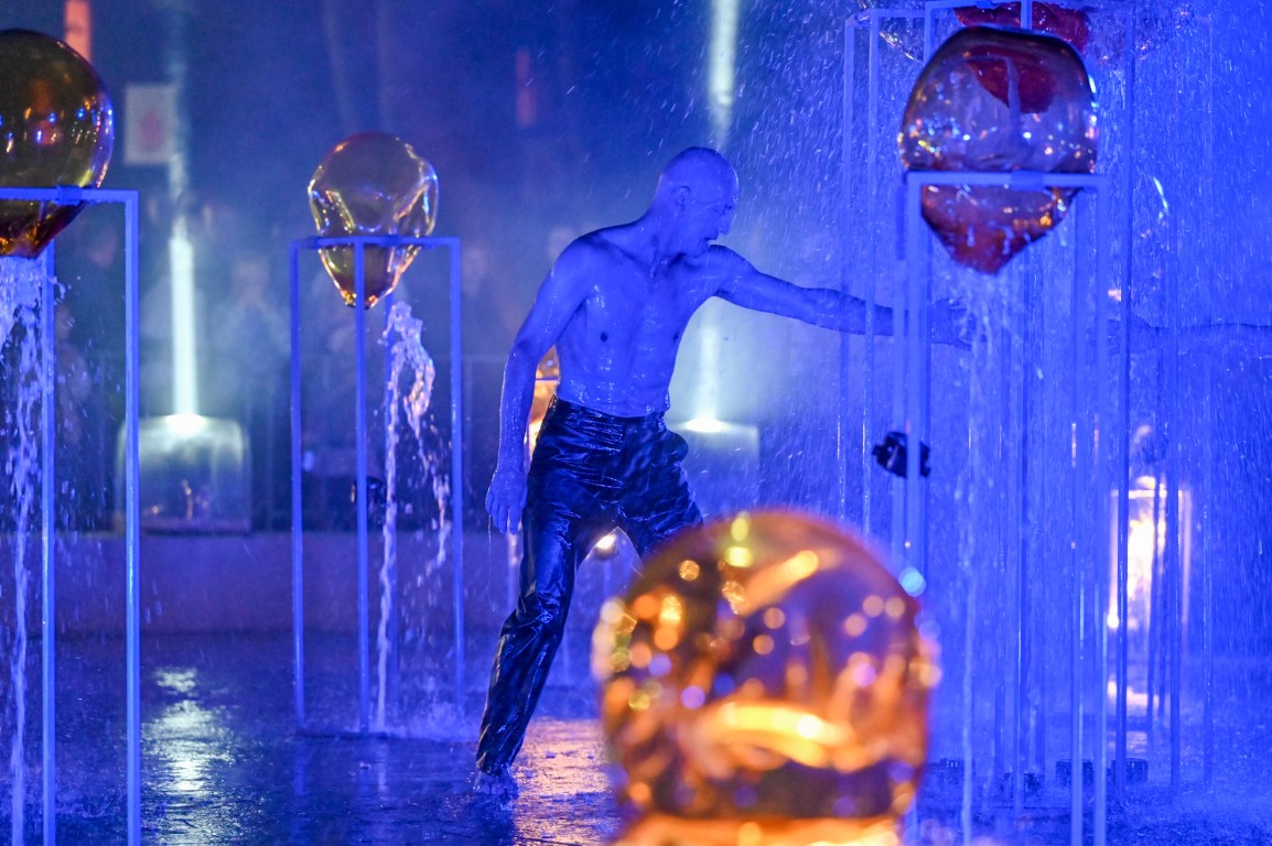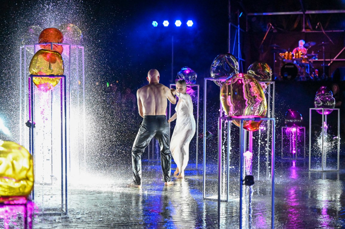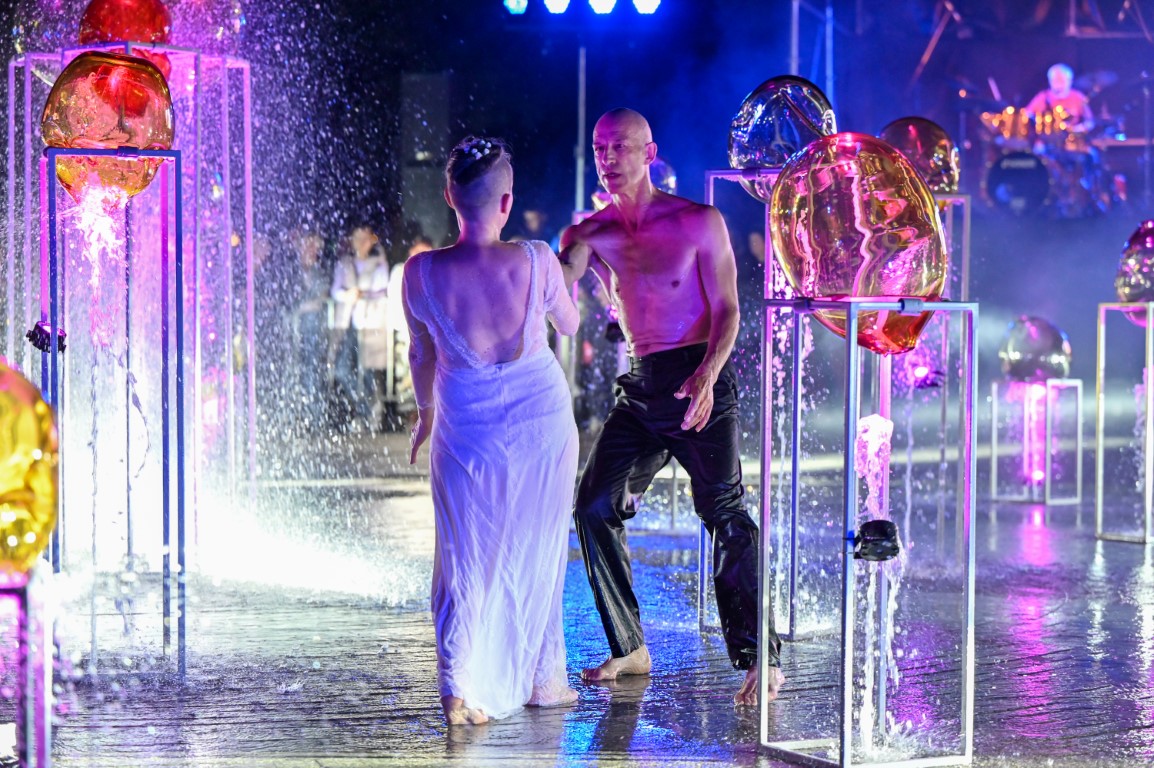 Performanso metu skambėjo mušamųjų muzika su savotiškais vokaliniais intarpais. Scena tapusiame fontane, papuoštame stiklo skulptūromis, pasirodė du šokėjai, blyškioje šviesoje šokio judesiais vaizdavę siužetą.