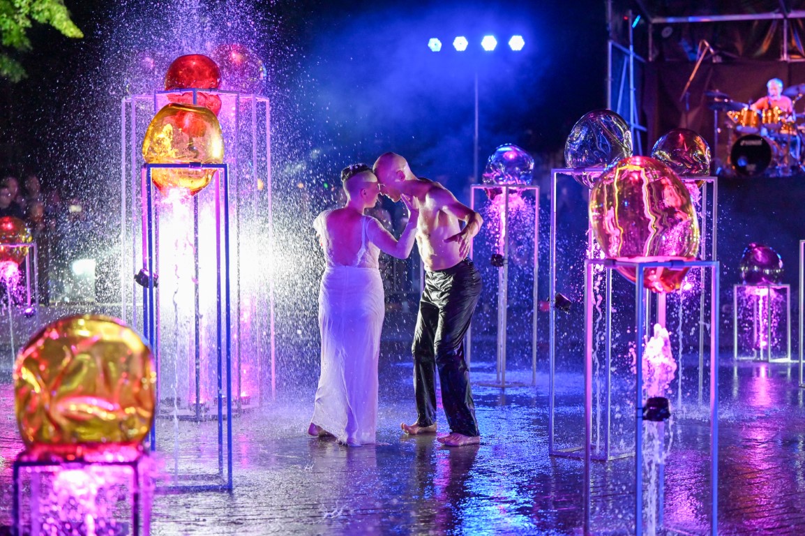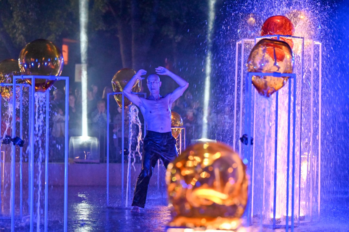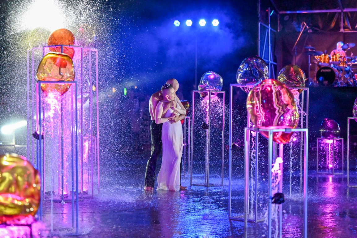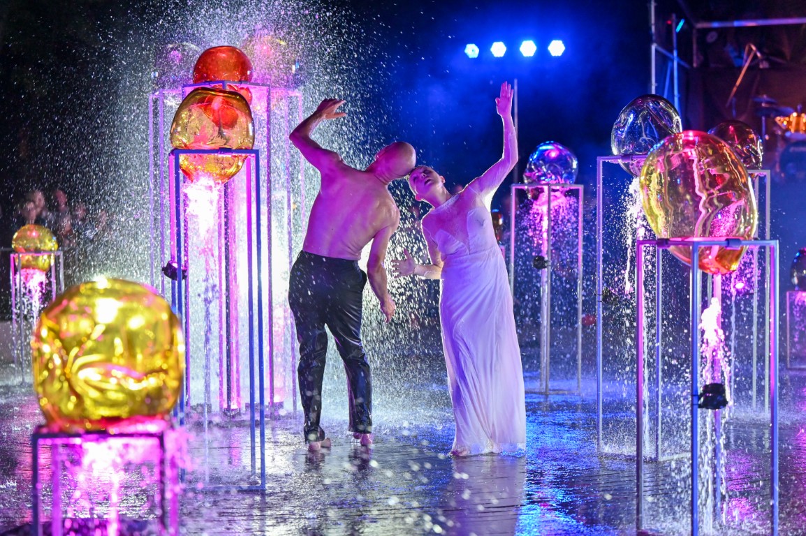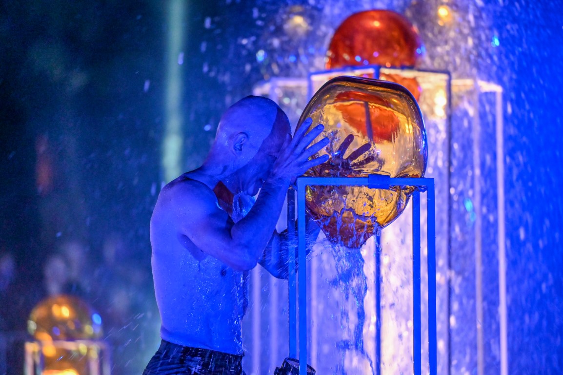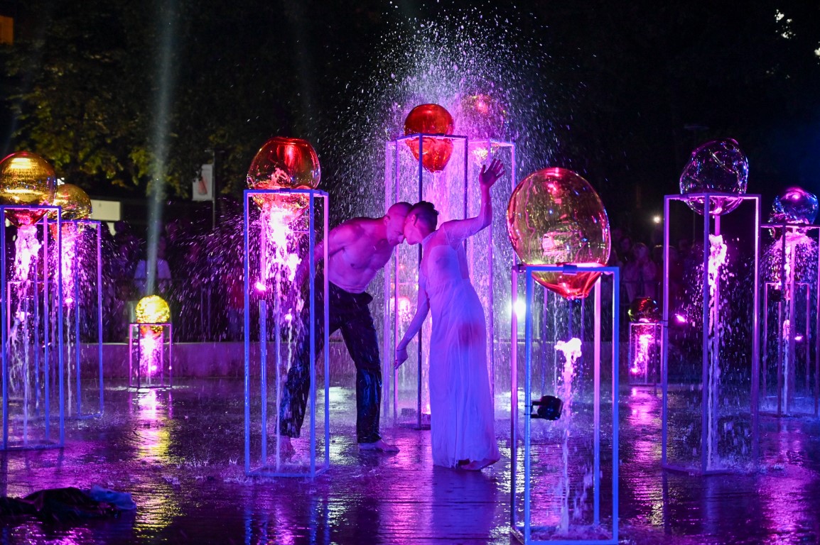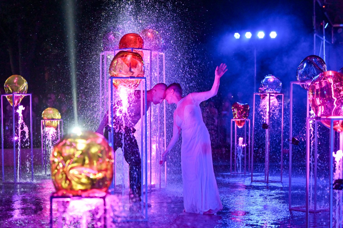 Performanso metu skambėjo mušamųjų muzika su savotiškais vokaliniais intarpais. Scena tapusiame fontane, papuoštame stiklo skulptūromis, pasirodė du šokėjai, blyškioje šviesoje šokio judesiais vaizdavę siužetą.