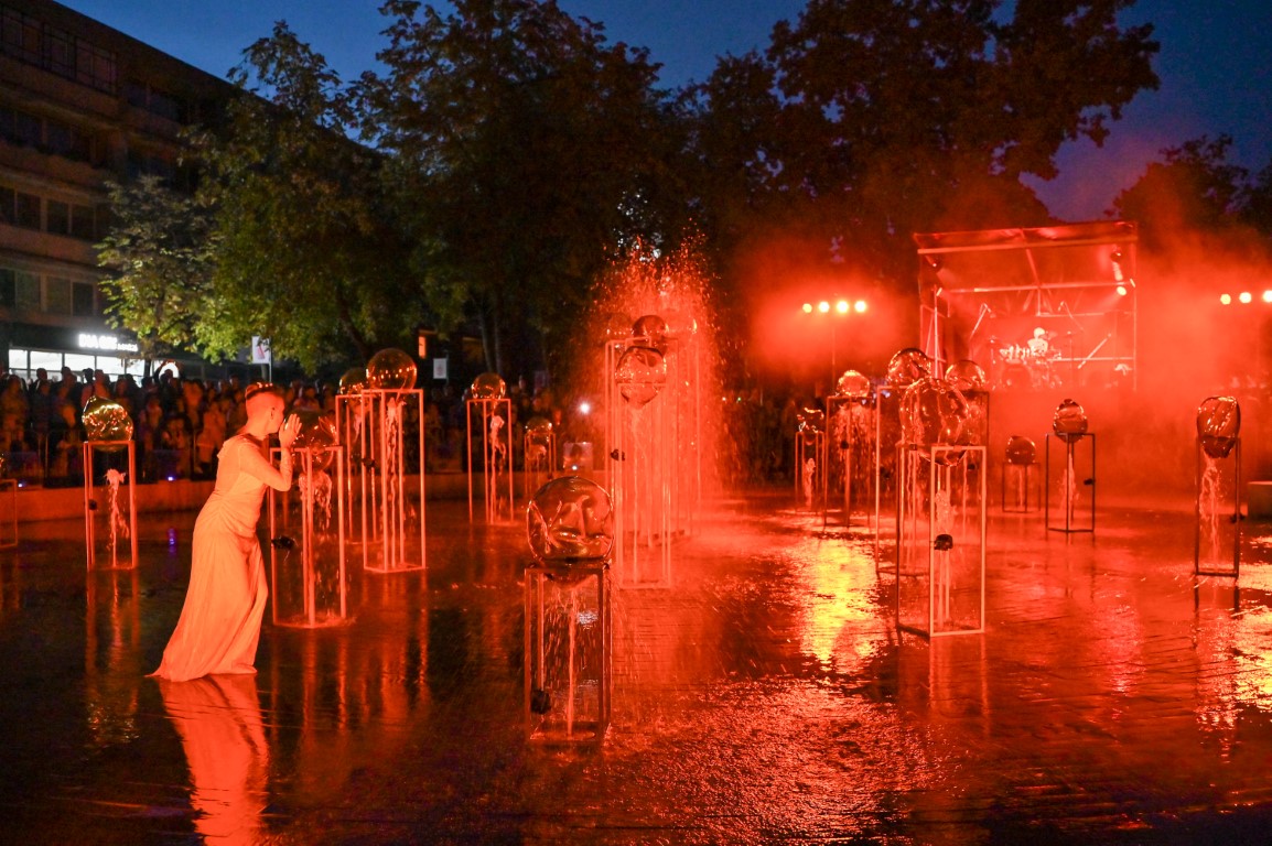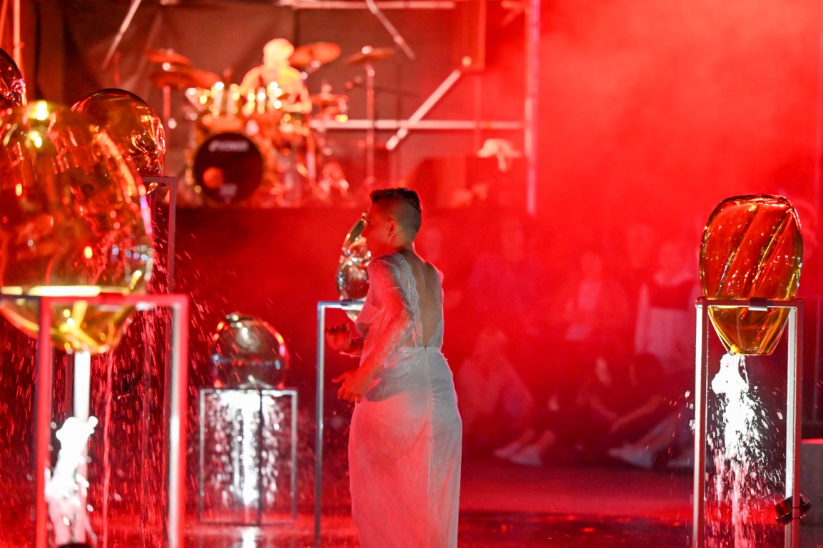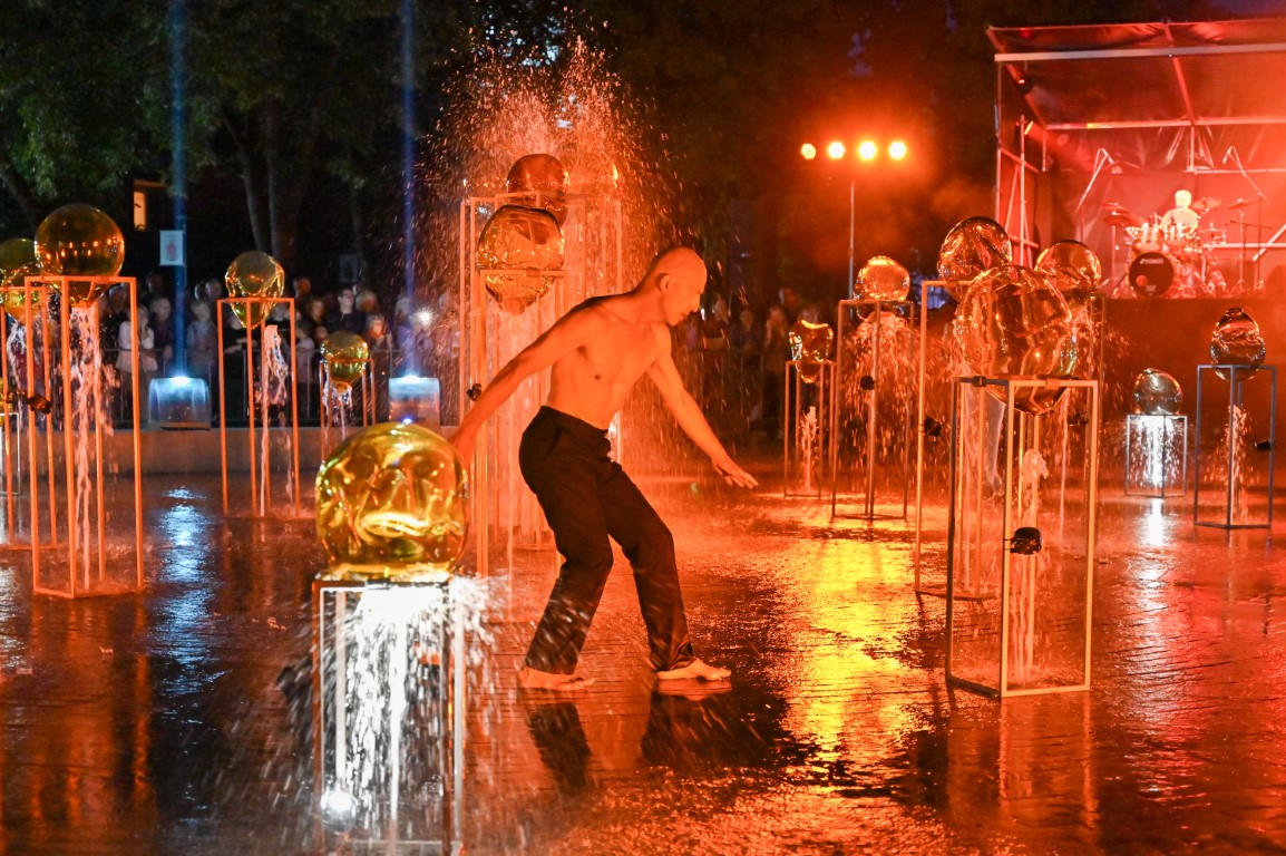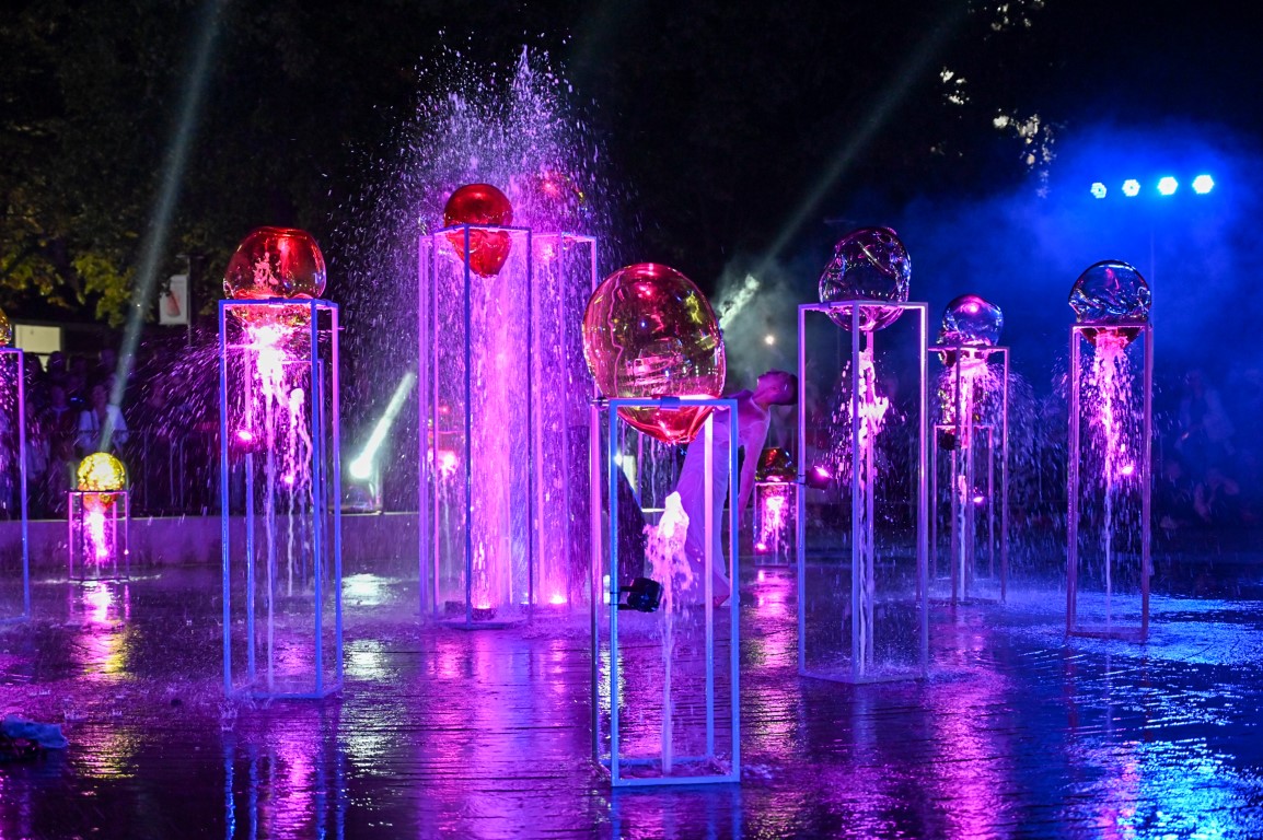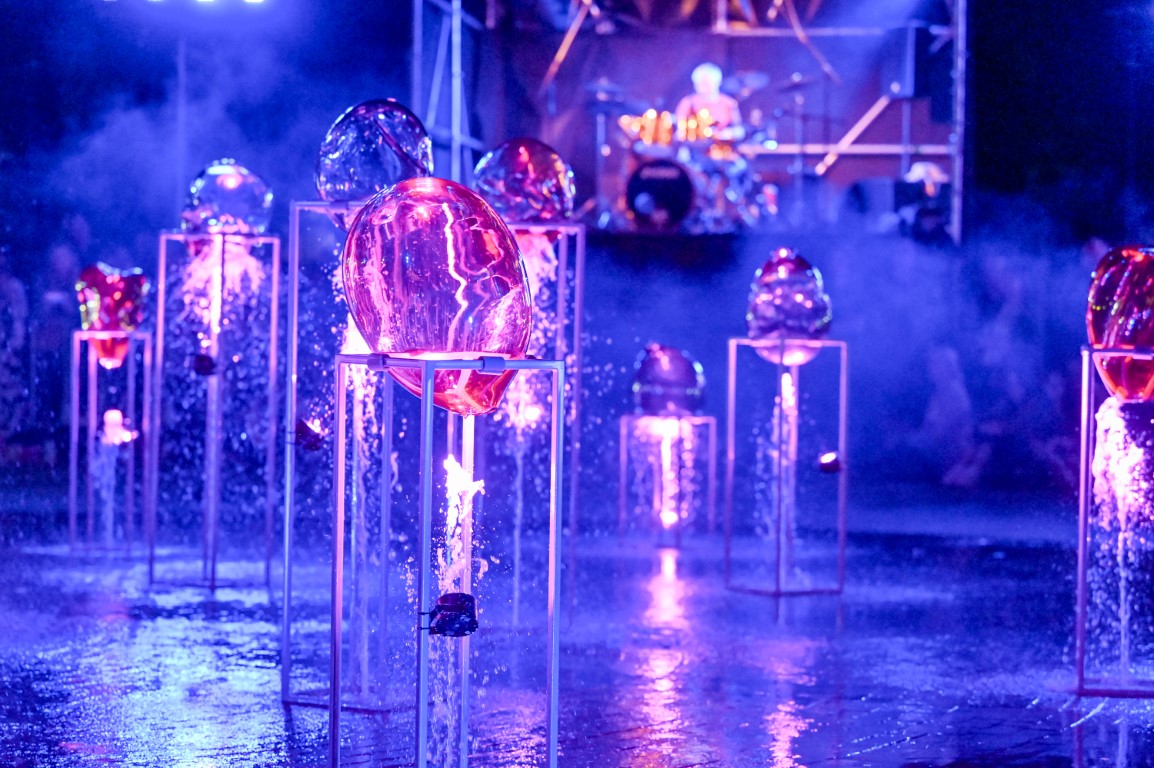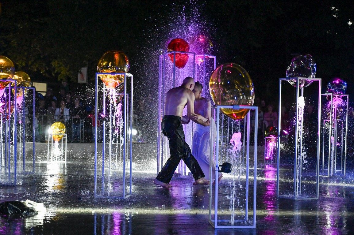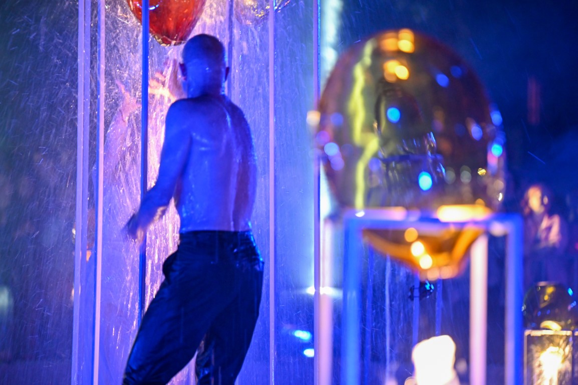 Performanso metu skambėjo mušamųjų muzika su savotiškais vokaliniais intarpais. Scena tapusiame fontane, papuoštame stiklo skulptūromis, pasirodė du šokėjai, blyškioje šviesoje šokio judesiais vaizdavę siužetą.