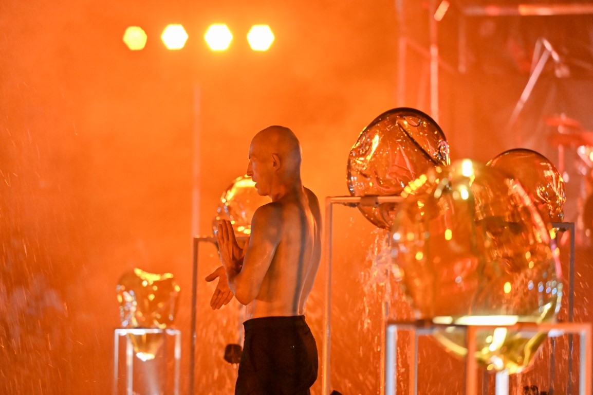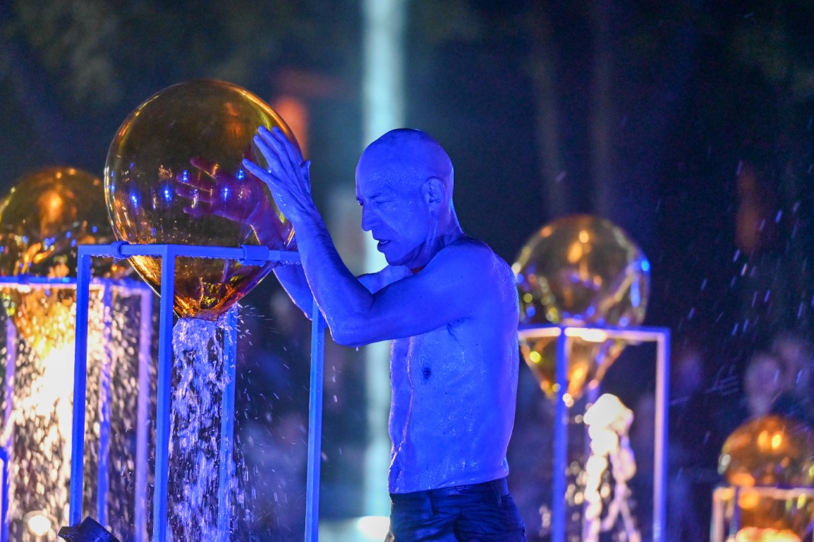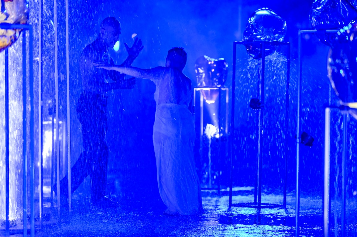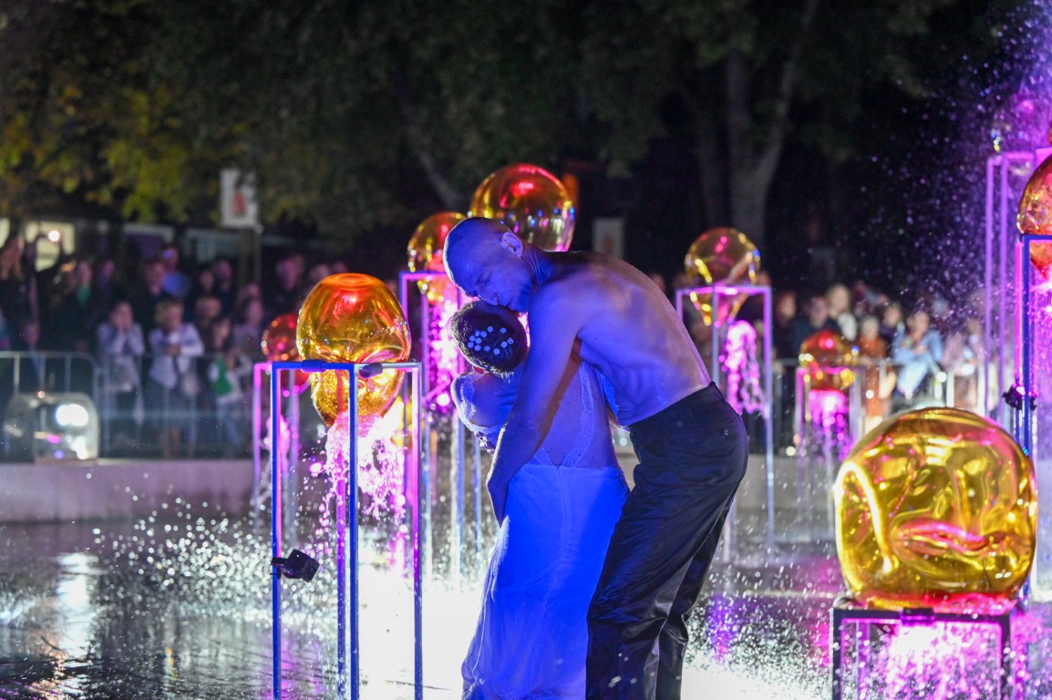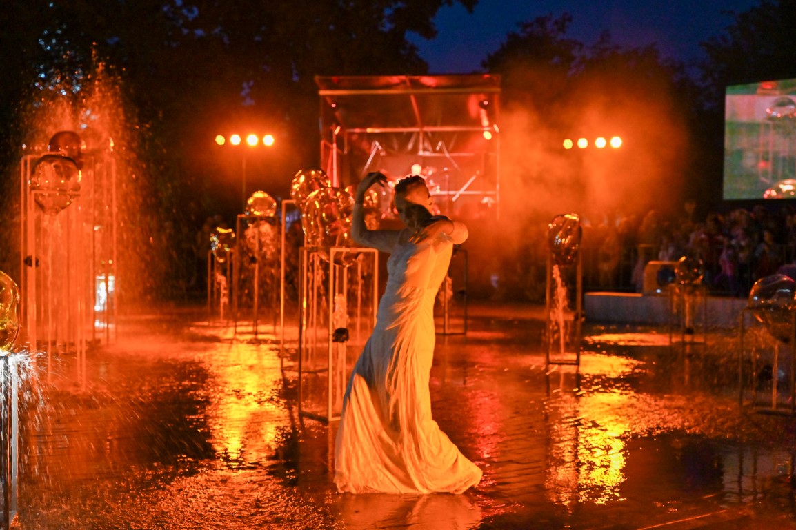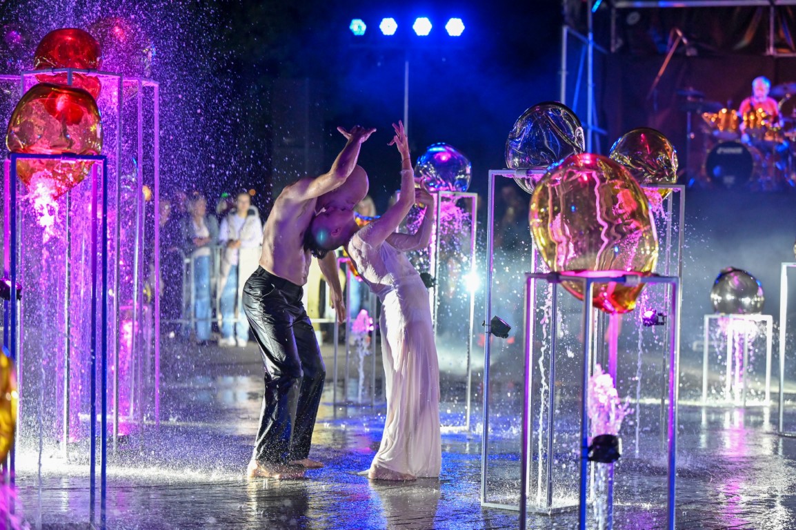 Performanso metu skambėjo mušamųjų muzika su savotiškais vokaliniais intarpais. Scena tapusiame fontane, papuoštame stiklo skulptūromis, pasirodė du šokėjai, blyškioje šviesoje šokio judesiais vaizdavę siužetą.