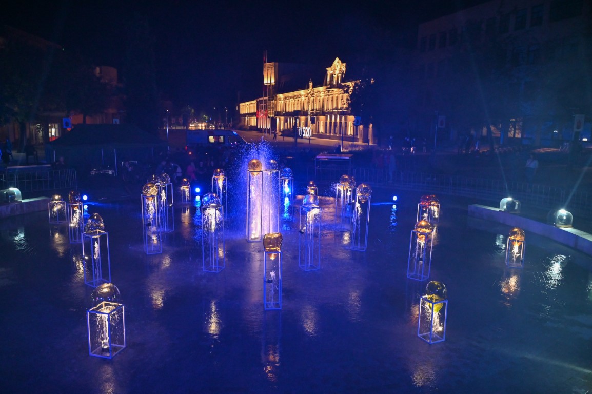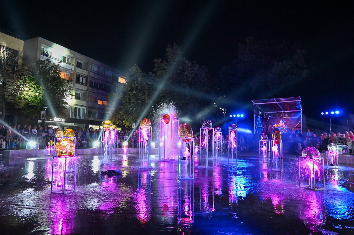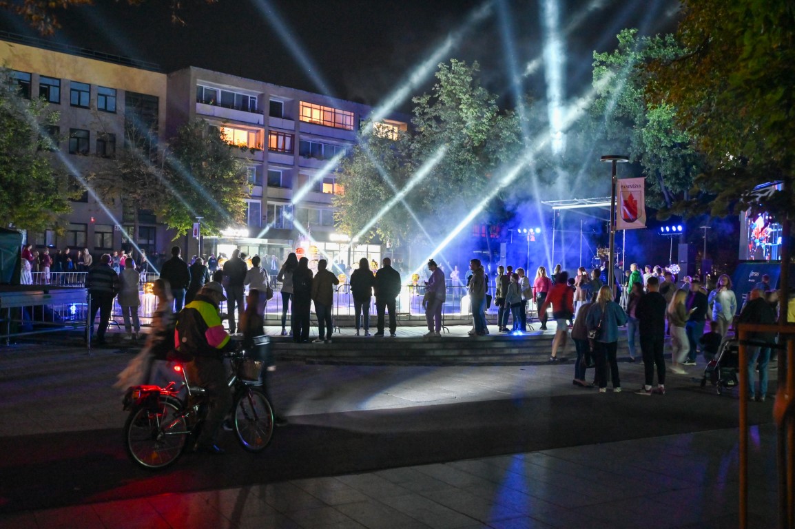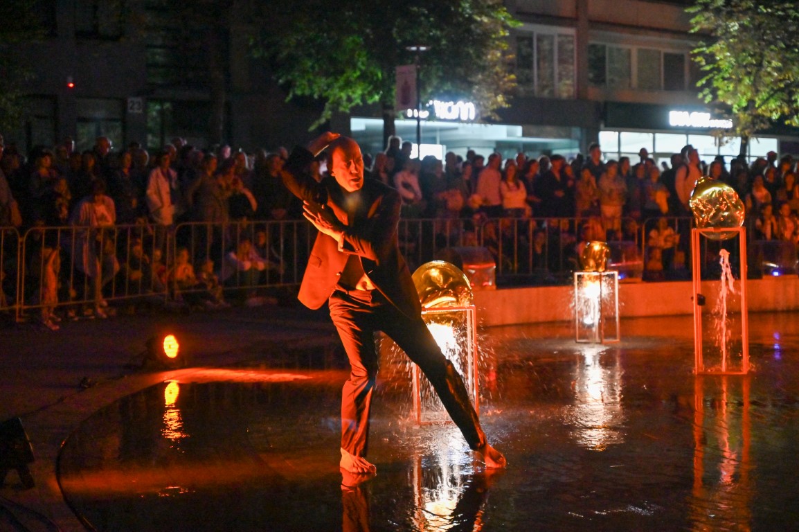 Švenčiantį Panevėžį apgaubus sutemoms, penktadienio vakarą Laisvės aikštę nušvietė šviesų, muzikos, šokio ir stiklo meno sintezė – performansas „Virsmas“.