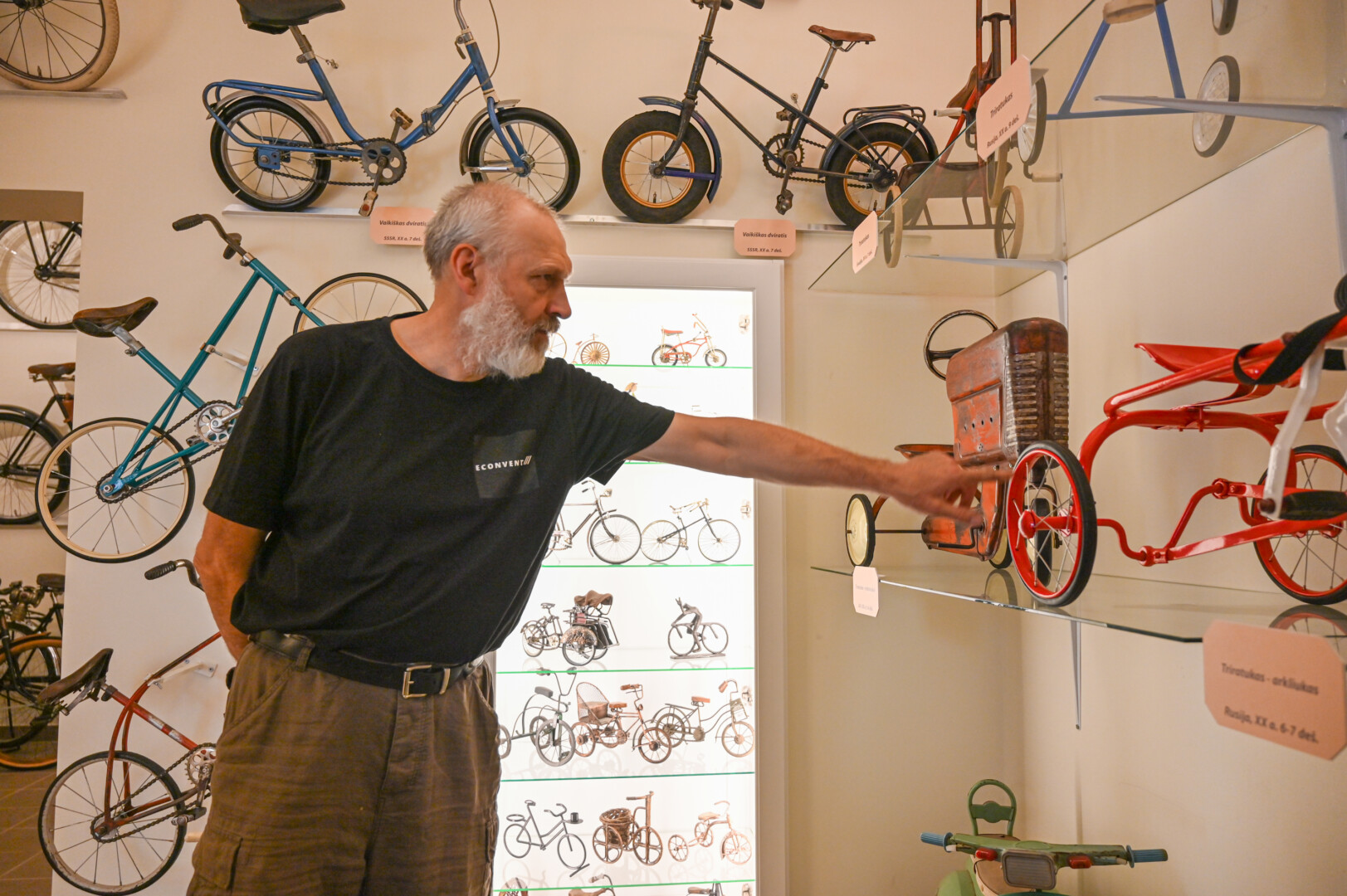„Sandėliuose – dar dvigubai tiek eksponatų, laukiančių savo eilės. Trūksta patalpų jiems eksponuoti. Bet tikiu, kad galime surinkti visą įdomią dviračių istoriją“, – sako svetingas Dviračių muziejaus įkūrėjas.