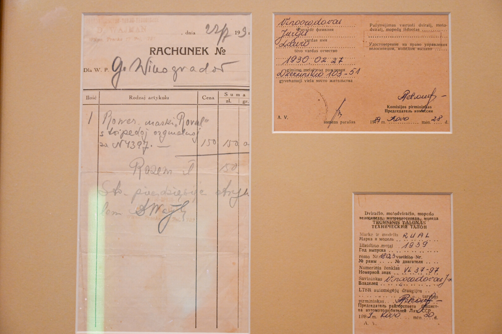 Vienas įdomesnių dviračių – kardaninis, neturintis dviračiams įprastos grandinės. O dar vieną eksponatą kolekcininkui pavyko gauti su visais dokumentais. Vilniuje gyvenantis 1930-aisiais gimęs vyras ne tik išsaugojo savo devintojo gimtadienio proga gautą dviratį, bet ir visus dokumentus, įrodančius jo pagaminimo ir dovanojimo istoriją.
