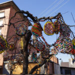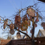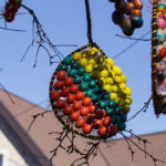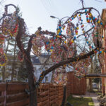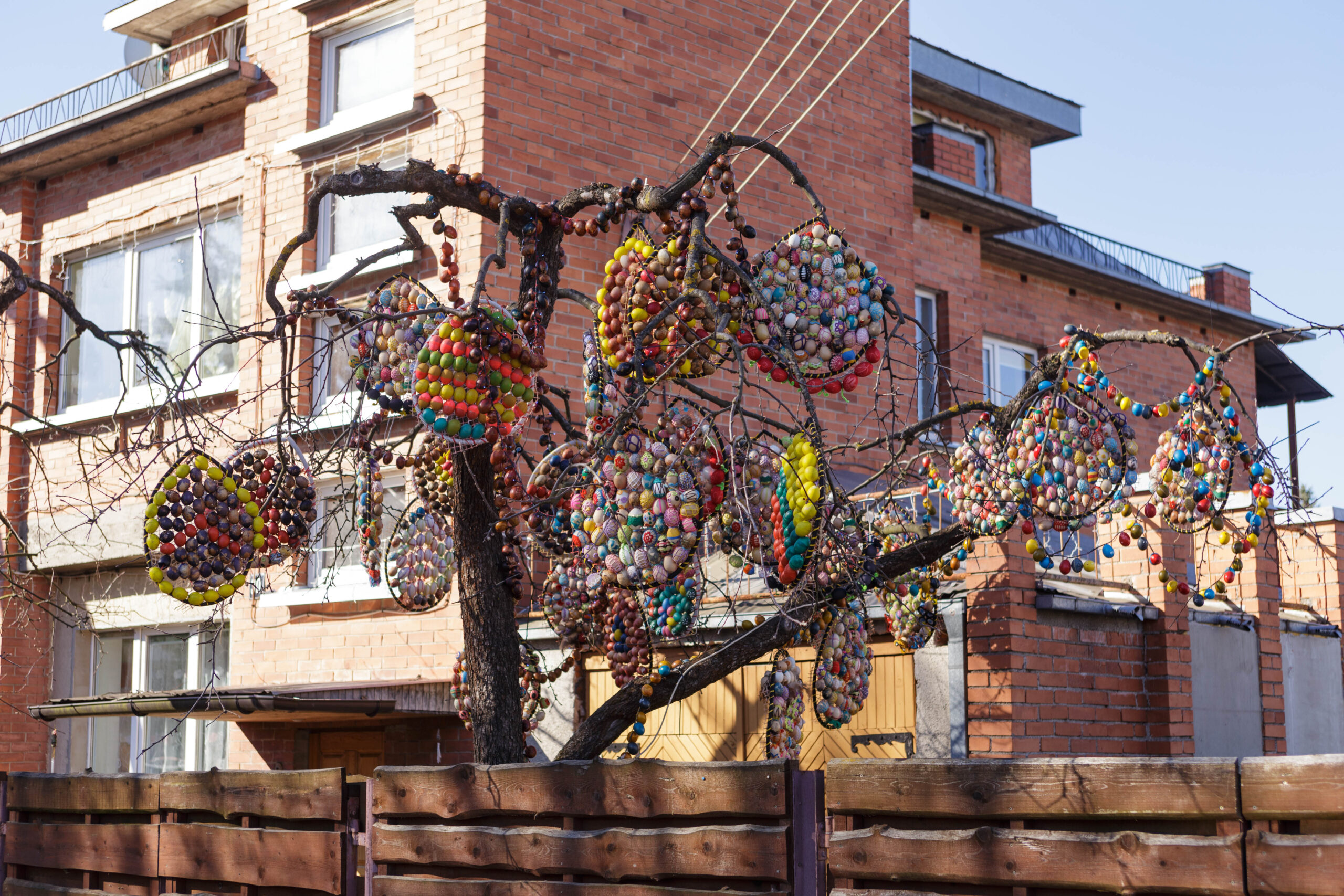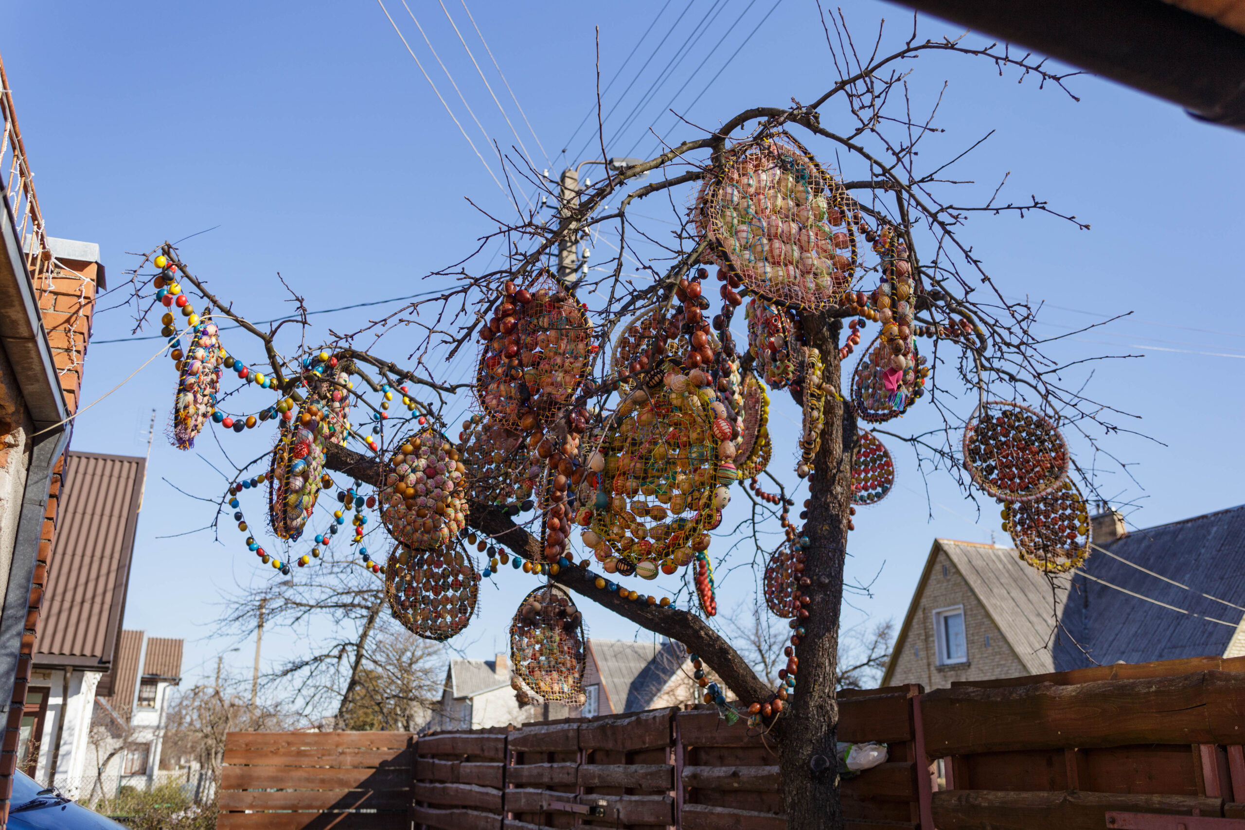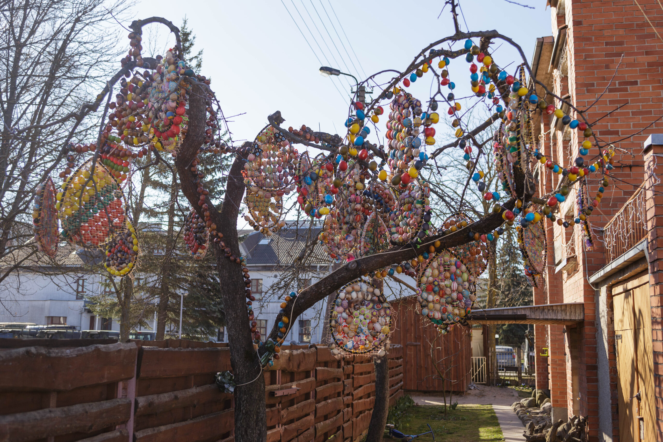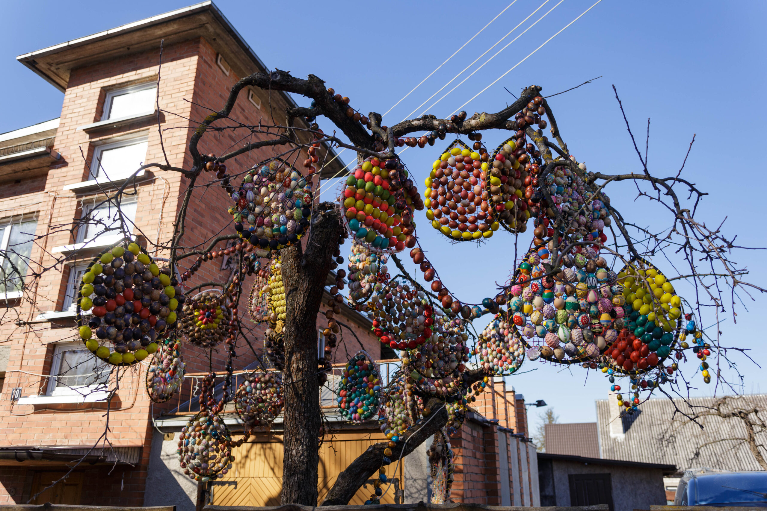 Vydūno gatvės gyventojos Aldonos Ladavičienės Velykų medis traukia praeivių akį jau ne vieną pavasarį. Kasmet jis vis kitoks. Pernai moteris kiaušinius jungė į vieną ir kabino masyvias dekoracijas. Joms buvo sunaudojusi daugiau nei 2 200 kiaušinių. Šiemet kūrybinga panevėžietė dar sumąstė papildomai prikabinti kiaušinių ant naujametinių girliandų. Tam panaudojo dvi tokias girliandas. Ant vienos sukabino beveik 300 kiaušinių, o ant kitos – daugiau nei pusę tūkstančio. Taigi iš viso A. Ladavičienės kieme ant medžio siūbuoja per 3000 kiaušinių.