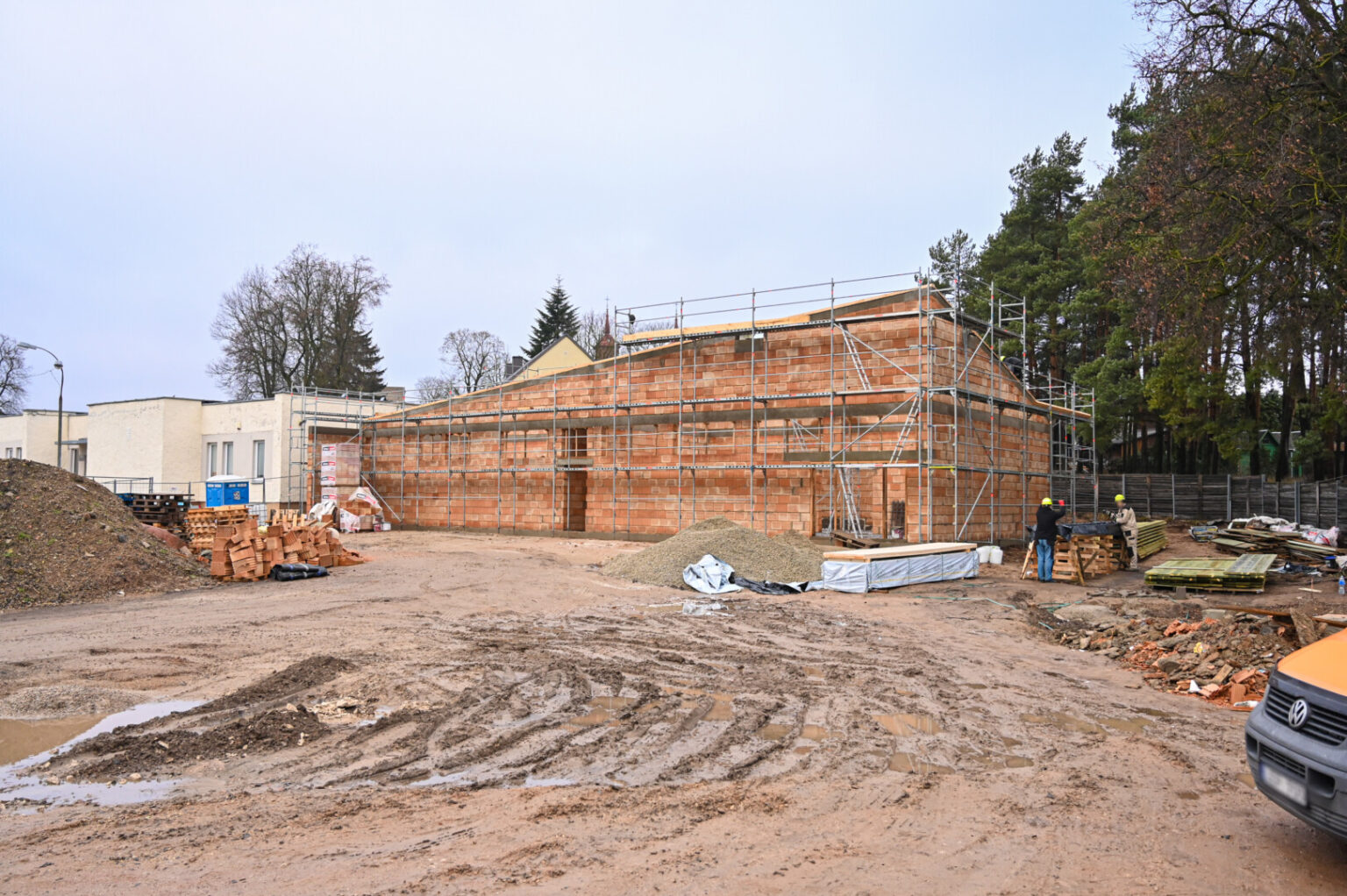 Jau įrengti lauko inžineriniai tinklai, tiekiamo ir kanalizuojamo vandens sistemos, sumūrytos pastato sienos, pradėtos montuoti stogo konstrukcijos, o grindys paruoštos betonuoti.