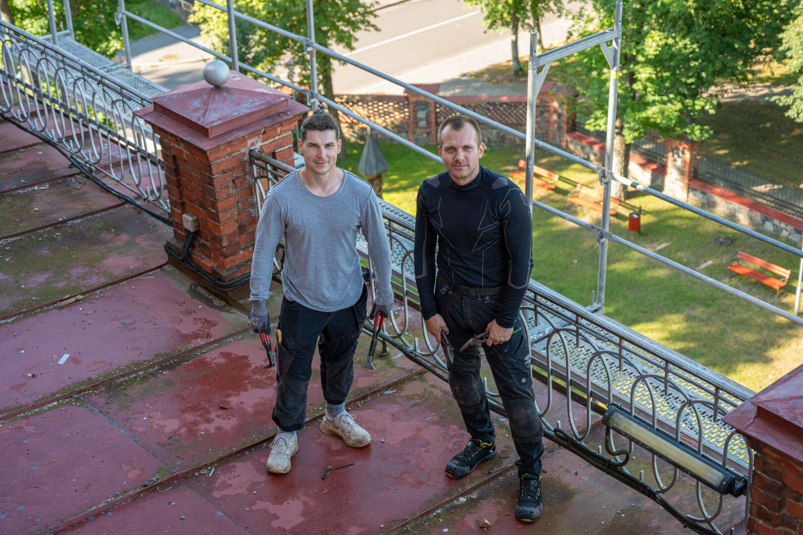 „Važiuodami į darbą pakeliui degalinėse būtinai nusiperkame kavos. Išgeriame ją prieš lipdami ant bažnyčios stogo“, – šypsosi Mantas.