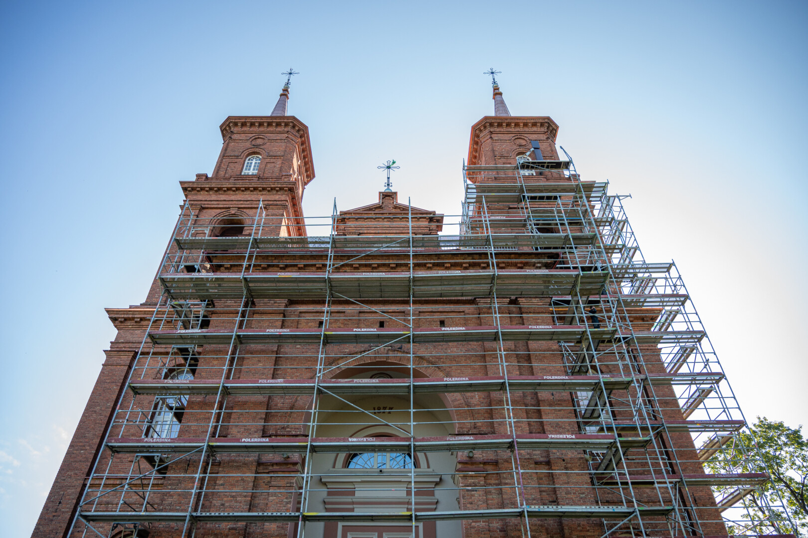 Nuo statybinių pastolių jau išvaduoti Šv. apaštalų Petro ir Povilo bažnyčios švytintys bokštai iš tolo traukia akį.