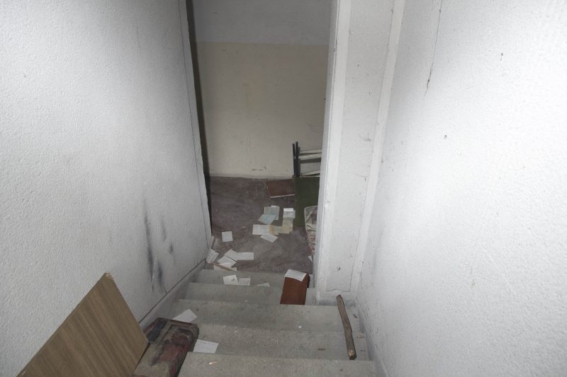 Pagal po balkonu sutiktų gyventojų nuorodą ieškome laiptų į rūsį, kur vaikai aptiko medicininių dokumentų. Ir iš tiesų šioje vietoje matyti akivaizdūs įrodymai, kad žmonės paskutinį kartą čia lankėsi tikrai neseniai – mėtosi traškučių, kramtomosios gumos pakeliai, vienas kitas plastikinis ar net stiklo butelis.