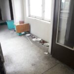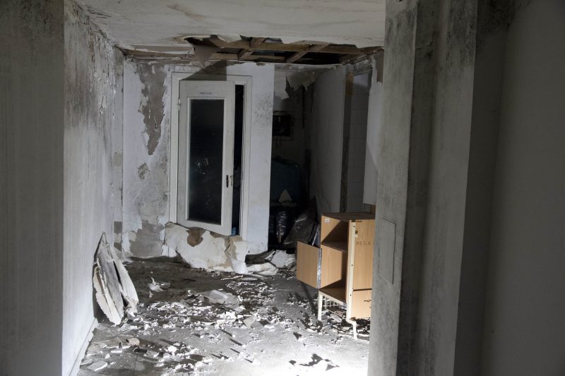Pirmo aukšto kambariuose, kur kadaise gydėsi sanatorijos klientai, po to – tuberkuliozės ligoninės pacientai, o po jų dar šeimininkavo nakvynės namų gyventojai, dabar telkšo balos. Buvusį gyvenimą primena paliktos sukrypusios lovos ar net dar apygerė sofa. Erdvioje salėje priklota čiužinių – visai taip pat, kaip prieš porą metų, kai šioje erdvėje ant jų nugriūdavo nakčiai į nakvynės namus užsukdavę benamiai. Atrodo, tarsi žmonės iš čia būtų išbėgę kaip stovi.
