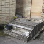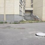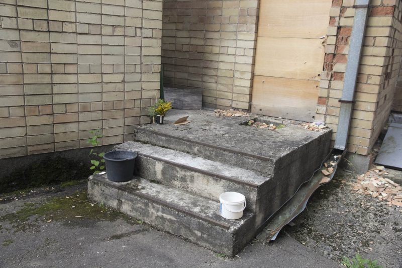 Pasinaudojame benamių patarimu neieškoti slaptų landų – eiti tiesiai prie pagrindinių durų. Šios užrakintos tik dėl vaizdo. Stiklas iki pusės durų seniai išdaužtas. Kažkas net duženas iššlavė, bet tuščios ertmės kažkodėl taip ir neužkalė. Todėl dabar čia pagrindinis įėjimas į pastatą. Ir, panašu, per jį iš tiesų vaikštoma, o kad būtų lengviau įlipti per durų angą be stiklo, čia pat dar padėta suklypusi kėdė.