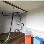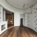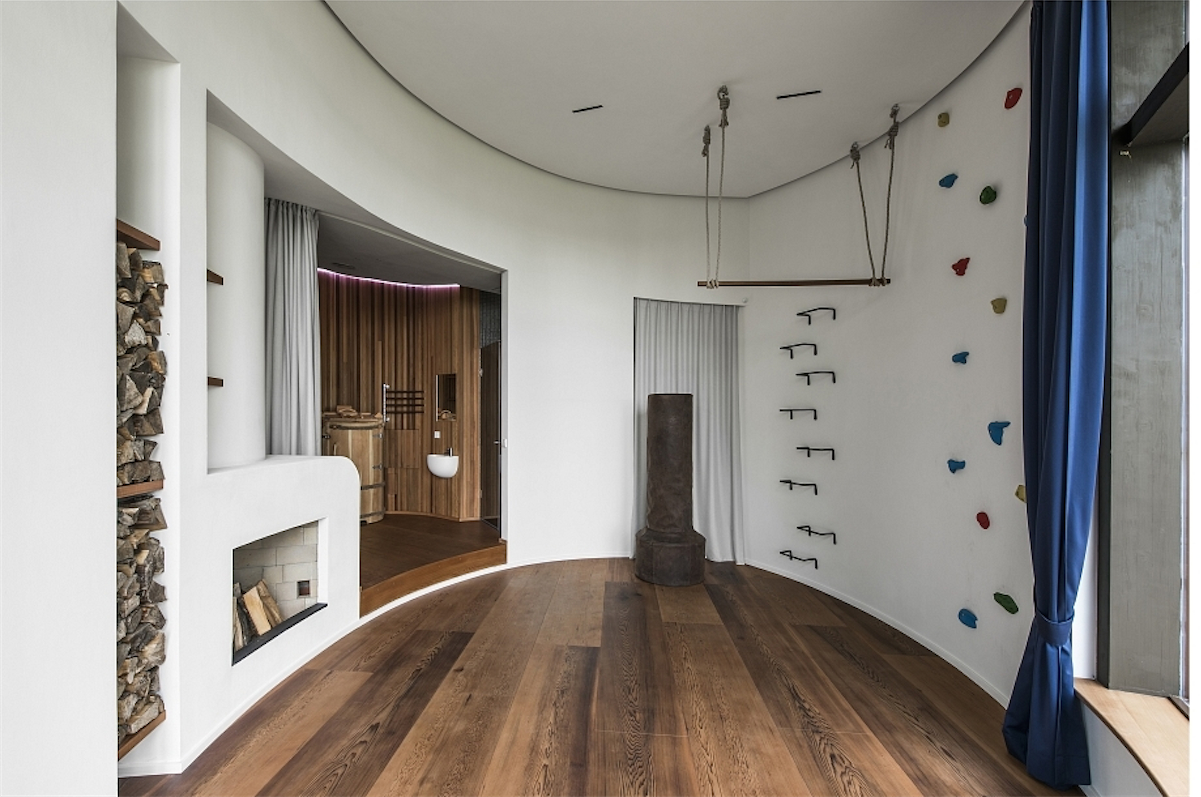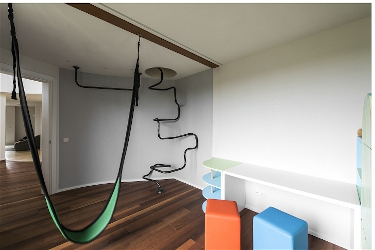 Nemažai dėmesio skirta vaikų poreikiams. Realizuota įdomi idėja – vaikų miegamasis antrajame aukšte vertikaliai sujungtas su žaidimų kambariu pirmajame; idėja, pasiskolinta iš gaisrininkų. Tačiau čia ji patobulinta: metalinis vamzdis ne tiesus, o vingriai išlankstytas, tad juo galima ne tik nusliuogti, bet ir užlipti aukštyn. Nuspręsta netgi atsisakyti apsauginės tvorelės – smarkiai raitytos formos vaikui neleisiančios skaudžiai nukristi.