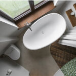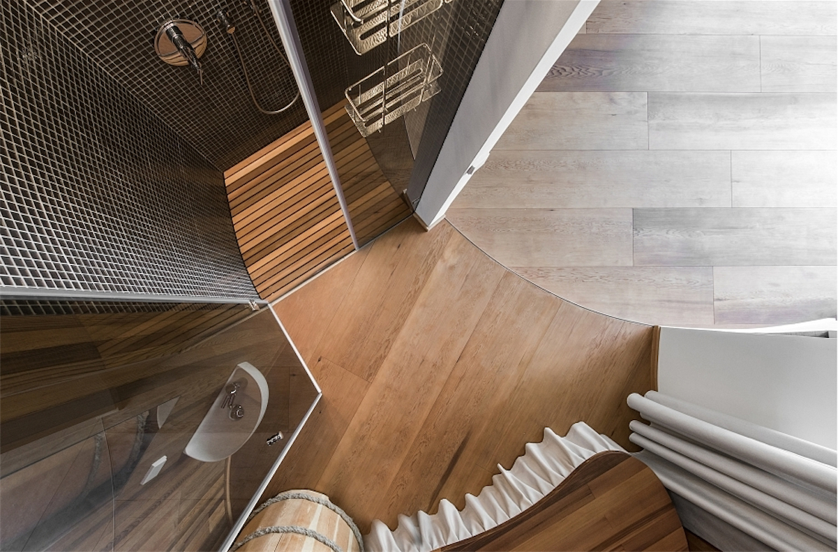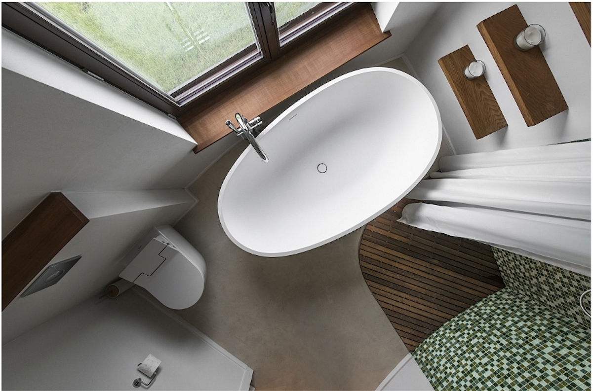 Natūralių medžiagų dermę stengtasi išlaikyti ir vonios kambaryje. Pavyzdžiui, dušo kabinoje plokščia stiklo pertvara būtų atrodžiusi svetima, todėl buvo nuspręsta pakabinti užuolaidą. Užsakovas norėjęs išvengti keraminių plytelių visur, kur įmanoma, ir netgi dušo kabinoje siūlęs dėti medines groteles. Rastas kompromisas, užtikrinantis tvarumą: vengiant tiesioginio kontakto su drėgme, molio grindys išklotos plytelėmis, o jas slepia medinės grotelės.