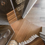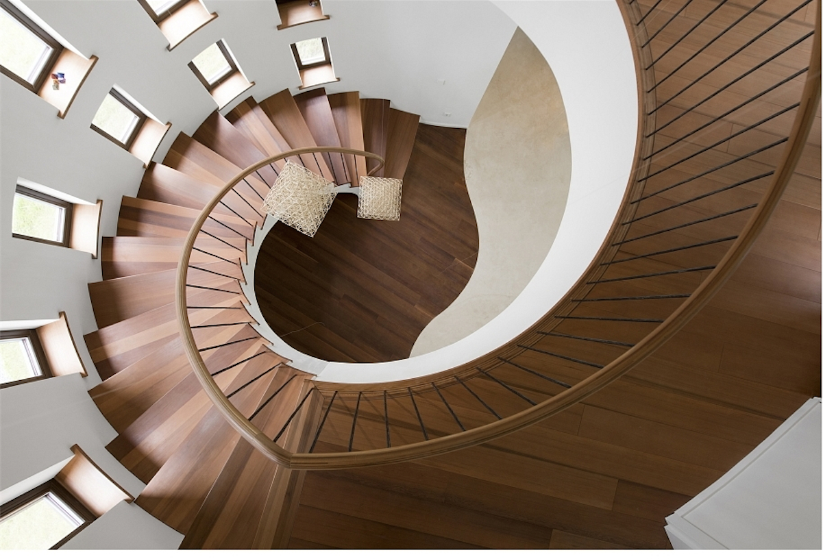 Lenktos linijos be centrinės ašies privertė dirbti su pieštuku rankoje eskizuojant vietoje. O brėžiant vaškuotos molinės aslos ir kedro parketlenčių sandūros liniją grindyse, teko naudotis virvelėmis. Dabar šie kontrastingų spalvų grindų vingiai vyrauja visame name.