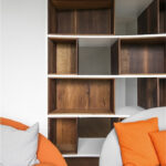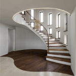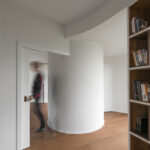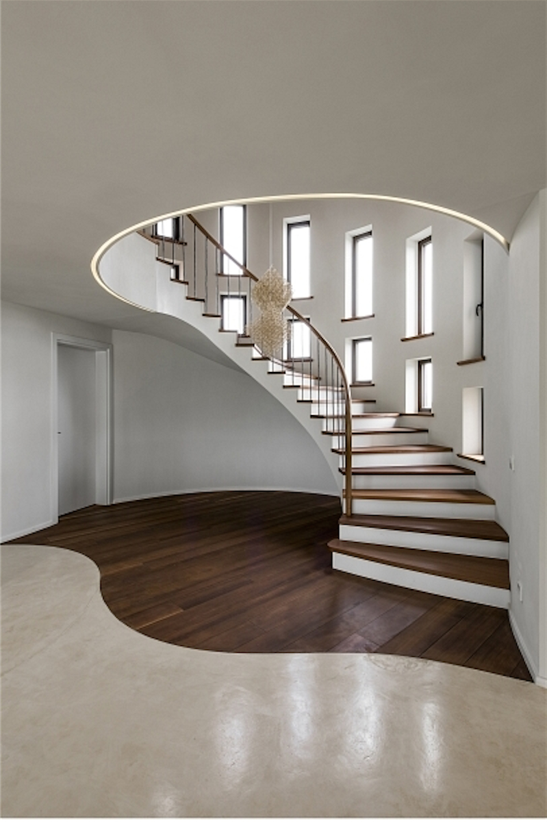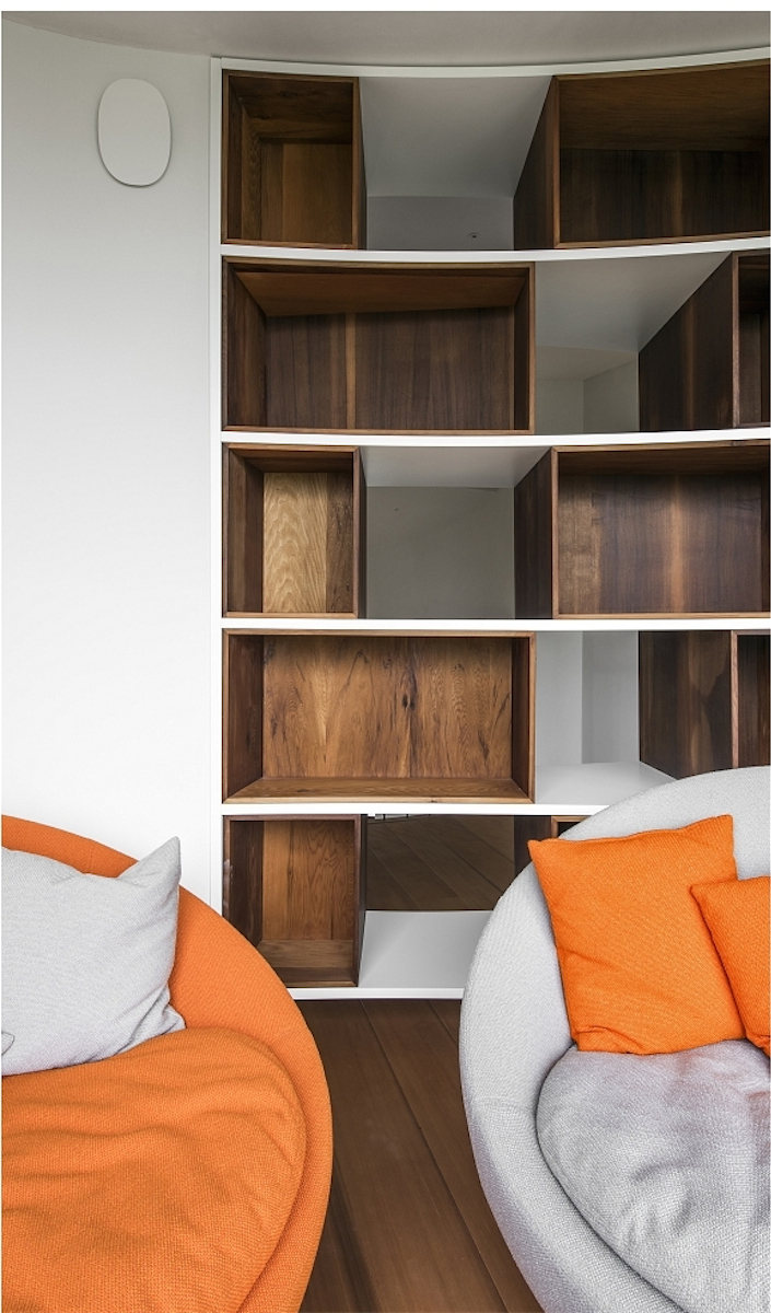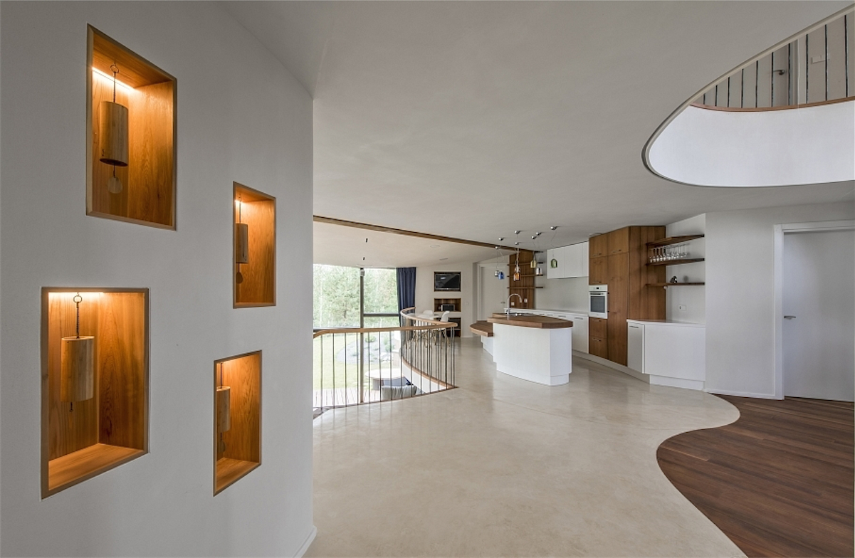 Aptakios, lenktos būsto erdvės privertė individualiai projektuoti korpusinius baldus, durų staktas. Nestandartiniai ir kiti elementai – laiptai, palangės, kedro medienos stalviršiai. Namo forma diktavo netgi spalvų ir šviesos sprendinius – didžioji dalis apšvietimo buvo paslėpta lubų nišose, slystančia šviesa akcentuojant lenktas formas. Šalia vyraujančios baltos spalvos parinkta ir pilkų atspalvių – jų dėka taip pat labiau išryškėja lekalinių formų sandūrų briaunos.