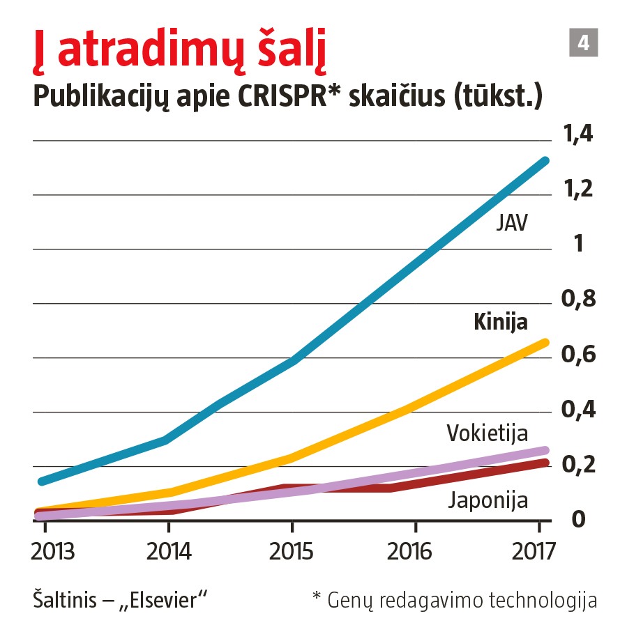 Tas pats galioja populiarioms biologijos sritims. He Jiankui – ne pirmas embriono DNR redagavęs žmogus. Ši garbė tenka mokslininkui Huang Junjiu iš Sun Yat-seno universiteto (Guangdžou). Kaip He Jiankui, Huang Junjiu, kurio tyrimai buvo nepriekaištingi ir sąžiningi, išnaudojo „CRISPR-Cas9“ galimybes. Nuo 2012 m. šis genų redagavimo būdas – bene daugiausia dėmesio sulaukianti biologijos sritis, o Kinija turi daug šios srities atstovų (žr. 4 grafiką). „Elsevier“ ir „Nikkei“ tyrimo duomenimis, Kinijai tenka 22,6 proc. labiausiai cituojamų pasaulio darbų apie genų redagavimą. Tai daugėliau kaip pusė amerikiečiams tenkančios dalies ir gerokai daugiau už bet kurią kitą šalį.