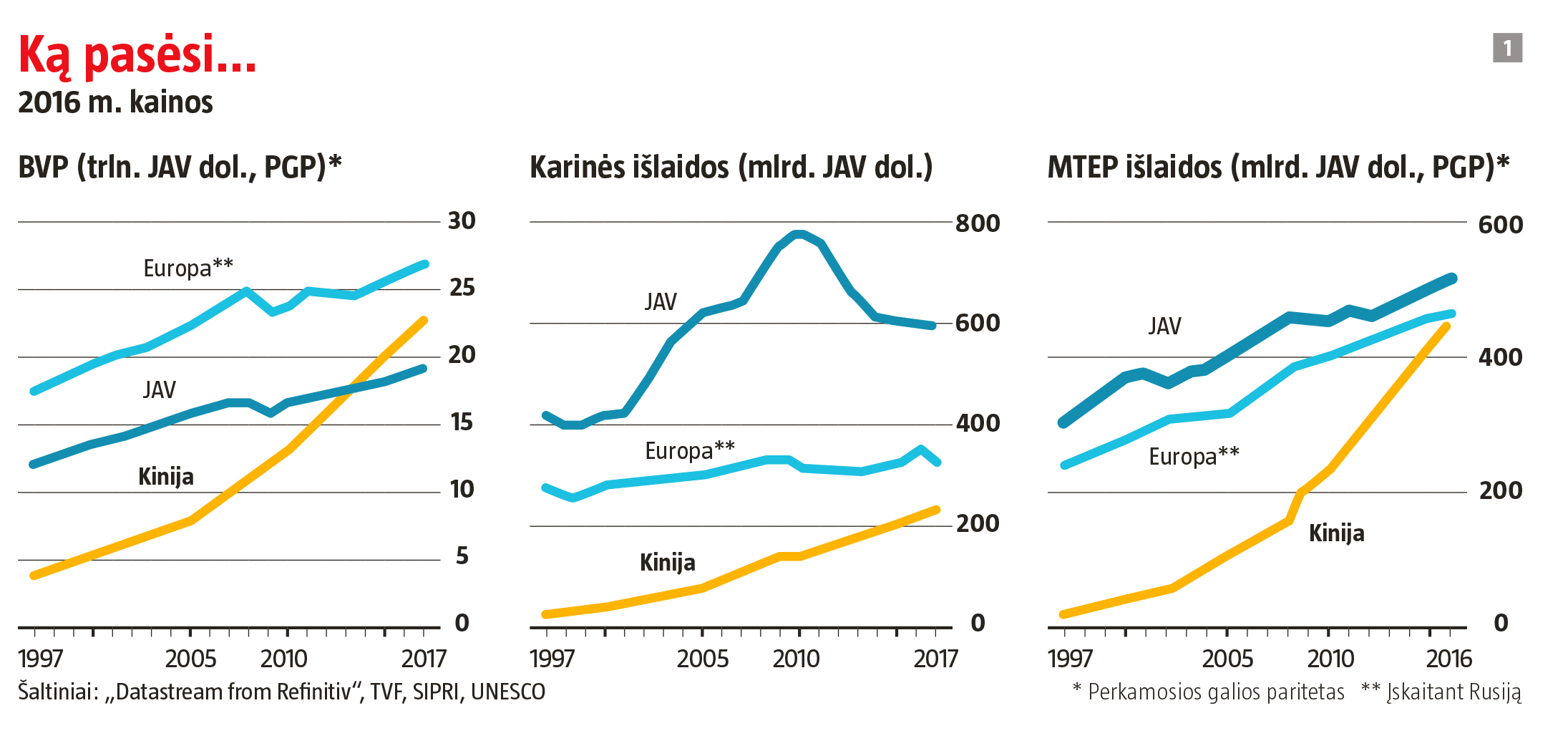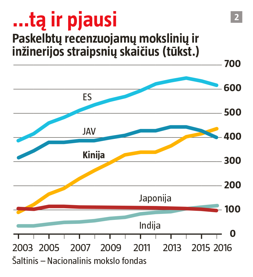 Susiejusi su mokslu daug vilčių, Kinija šiai sričiai negaili lėšų. 2000–2016 m. šalies išlaidos moksliniams tyrimams ir eksperimentinei plėtrai (MTEP) išaugo dešimteriopai (žr. 1 grafiką). Dosniai atvėrusi piniginę šalis įsigijo daug akį traukiančių gėrybių. Tarytumei kažkur Haidiano rajone Pekine, kur stovi Mokslo ir technologijų ministerija bei Činghua ir Pekino universitetai, pasidėjęs sąrašą valstybės tarnautojas ramiai žymi turimus mokslinio statuso simbolius. Žmogus kosmose? Yra. Milžiniški genų sekoskaitos kompleksai? Yra. Mokslinių tiriamųjų laivų flotilė?