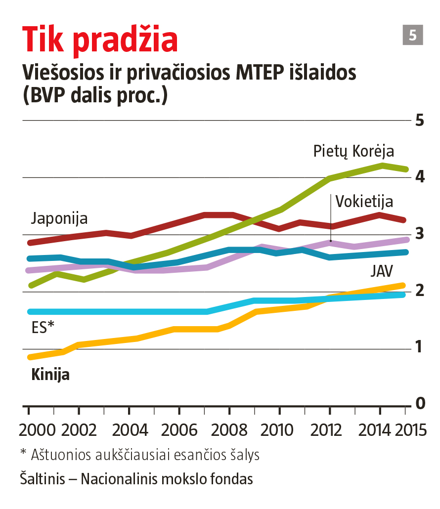 Rodiklis didesnis nei Europos valstybių vidurkis, nors nesiekia Prancūzijos, Vokietijos ar JAV lygio ir toli atsilieka nuo Azijos šalių, kurias verta vytis, galbūt natūraliausio palyginimo taško – nuo Japonijos ir Pietų Korėjos. Jei Kinija moksliniams tyrimams skirtų tokią pat BVP dalį kaip Pietų Korėja, šalies MTEP biudžetas būtų dukart didesnis nei šiandien. Turint tiek išteklių ir milijonus mokslo darbuotojų, korumpuotų institucijų užmestus pančius būtų galima nusimesti jėga.