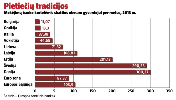 Tačiau kitos šalys gerokai pralenkė Lietuvą (žr. grafikus). Elektroninės atsiskaitymų priemonės populiariausios skaitmenines technologijas entuziastingai vertinančiose Skandinavijos šalyse, o be grynųjų gyvenimo neįsivaizduoja bulgarai, rumunai ir graikai. Ekspertai teigia, kad per metus vidutiniškai 100 asmeniui tenkančių atsiskaitymų kortelėmis žymi lūžio tašką, kai gyventojai pasirengę atsisakyti grynųjų. Latvija ir Estija šią ribą jau peržengusios. Išimtis tarp Vakarų ir Šiaurės Europos šalių yra Vokietija, kurios piliečiai baiminasi dėl duomenų saugumo ir dėl skaudžių istorinių patirčių vengia, kad jų pavardės būtų registruojamos sąrašuose.