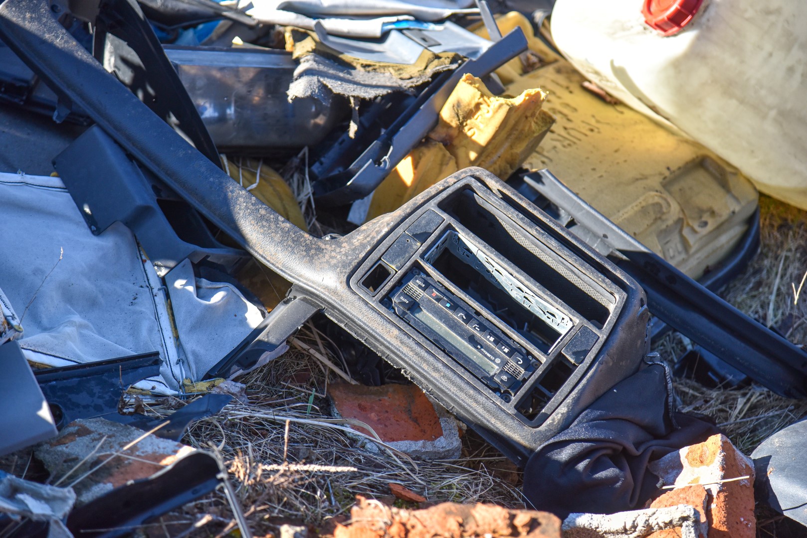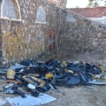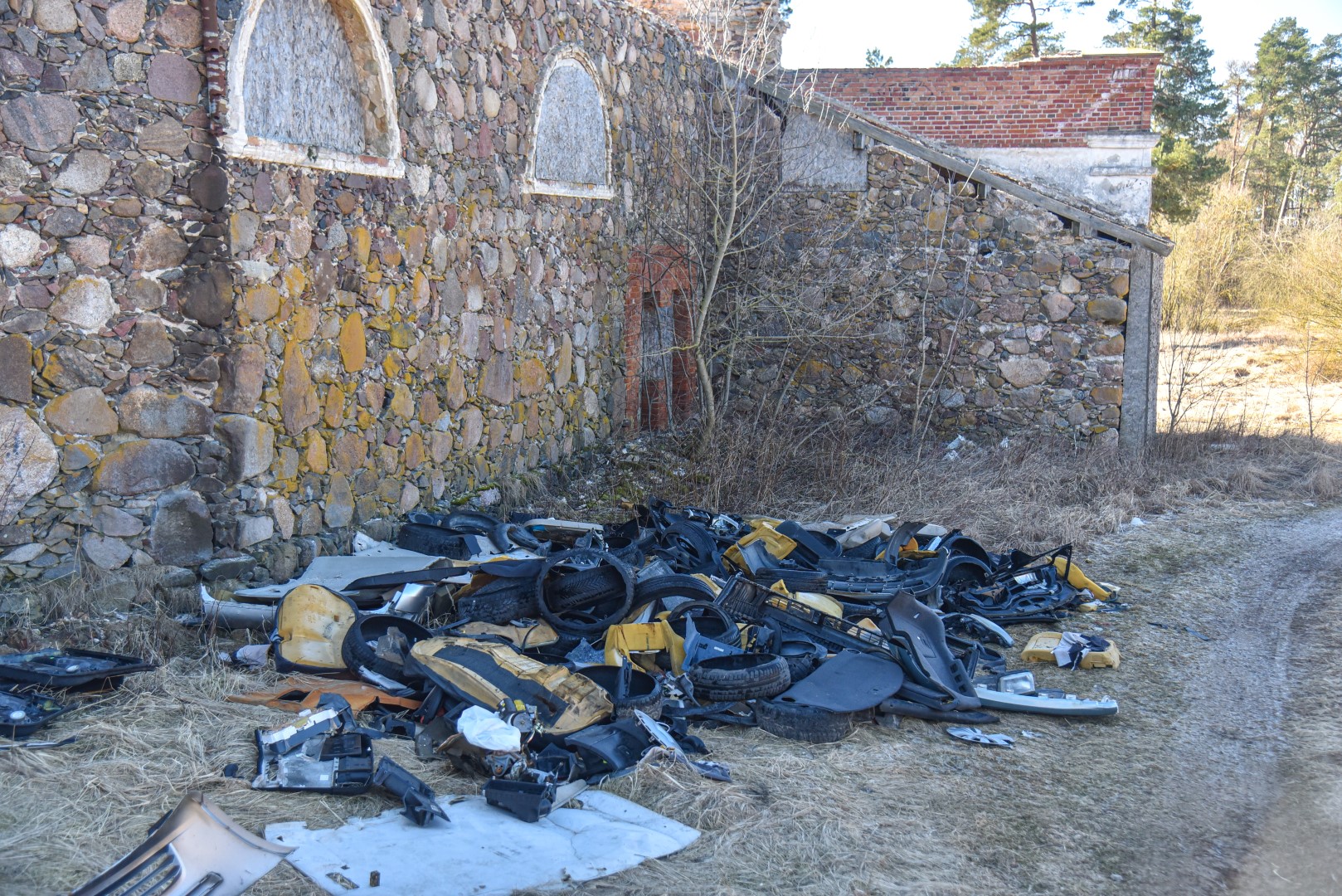 Greta apgriuvusių, bet vis tiek įspūdingai atrodančių akmeninių jos sienų suverstos krūvos senų padangų, automobilių sėdynės, kilimėliai, plastmasinės dalys, žibintai.