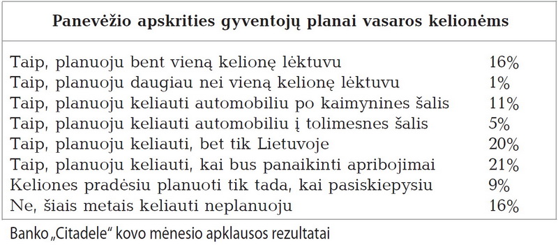 Kovo mėnesį gyventojų apklausą atlikęs bankas „Citadelė“ skelbia, jog net 69 proc. Lietuvos gyventojų šiemet nusiteikę pakeliauti, tačiau beveik kas penktas jų dėl saugumo ir pandemijos kliūčių ketina apsiriboti vietinio turizmo galimybėmis.
