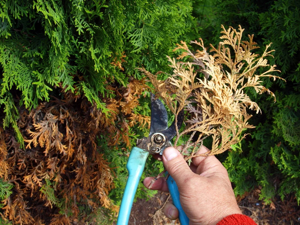 Ir dar: kai kurių spygliuočių, kaip tujos ar kadagiai, lajos tokios tankios, kad į jas nepatenka saulės šviesa. Bet praskleidę šakas išvysite, kiek viduj nudžiūvusių spyglių, kuriuos taip pat būtina pašalinti, antraip virs grybelinių infekcijų židiniu.
