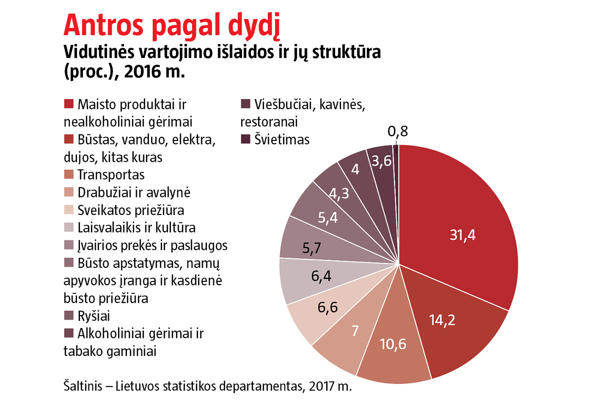 Statistikos departamento duomenimis, 2016 m. Lietuvos gyventojų įmokos už komunalines paslaugas ar šildymą sudarė 14,2 proc. visų vartojimo išlaidų (42,3 euro asmeniui per mėnesį). Daugiau žmonės atseikėjo tik (31,5 proc., arba 93,7 euro) maisto produktams įsigyti.
