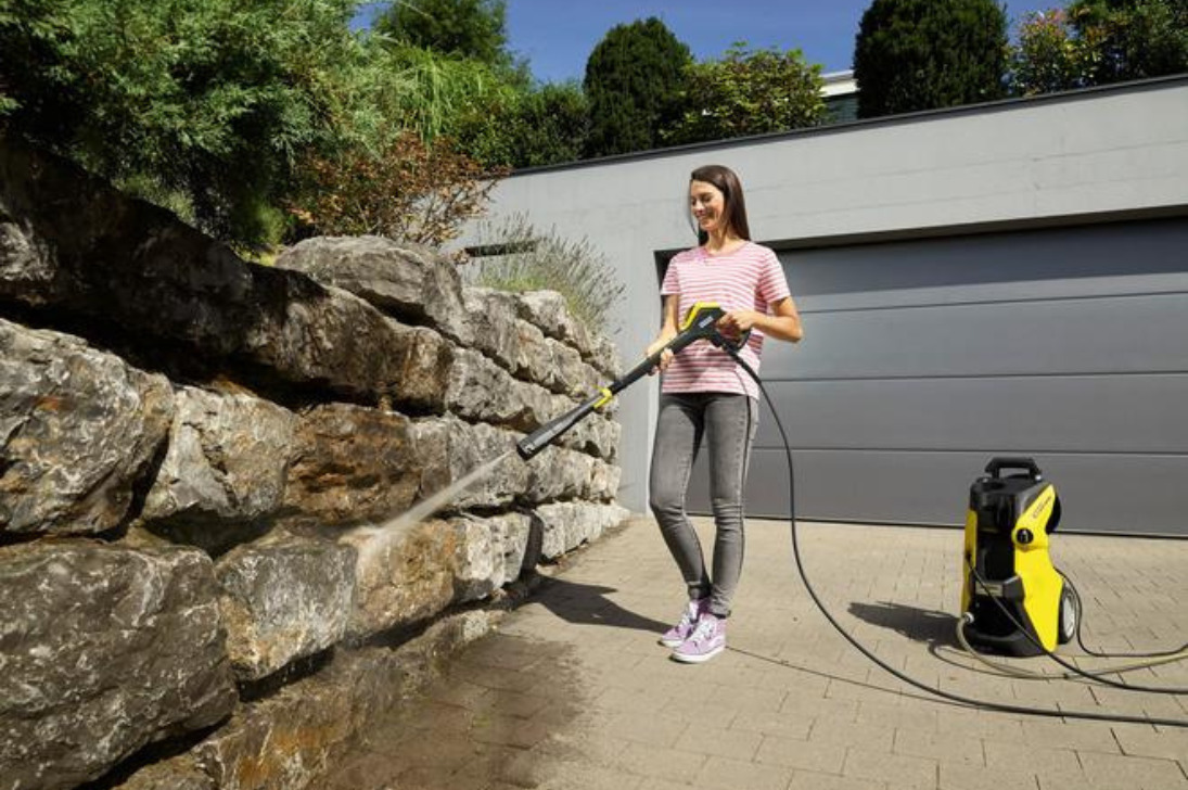 | Trinkelių ir kiemo valymas | Naudokite rotacinį arba turbo antgalį – jis padidina valymo galią. Dirbkite vienodu tempu, kvadratais po 1 m². Venkite užsibūti vienoje vietoje. Po plovimo naudokite priemones, stabdančias samanų augimą. |