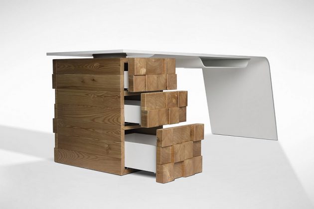 Prieštaringos – natūrali ir dirbtinė medžiagos tapo šio stalo dizaino pagrindu, jį sudaro lenktas baltas kompozitinės medžiagos „Kerrock“ stalviršis ir medinių tašų formos stalčių blokas. Aukštųjų technologijų prikimštas stalviršis gali paslėpti klaviatūrą ar nešiojamąjį kompiuterį, taip darbo vieta išlaikoma neapkrauta daiktais.