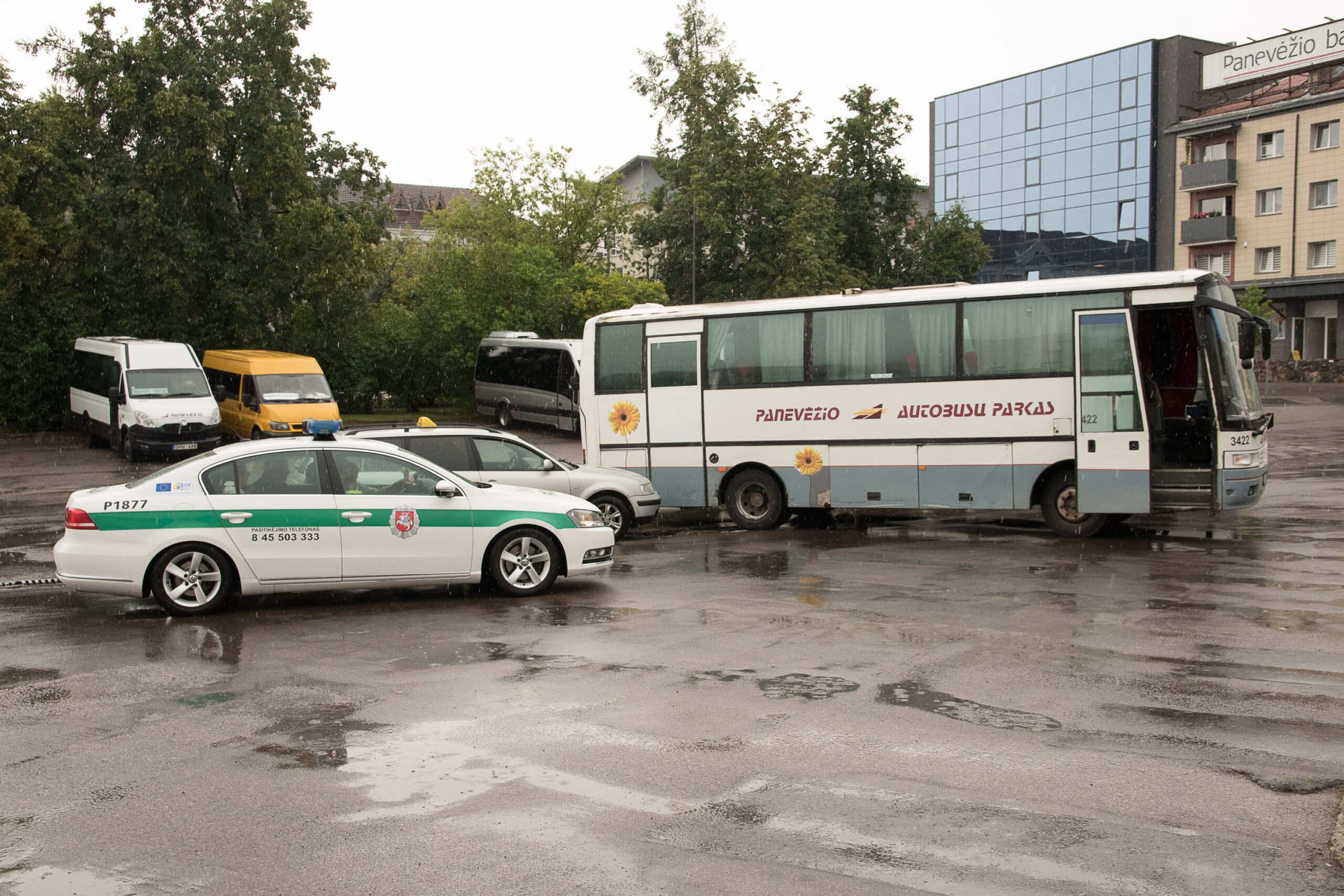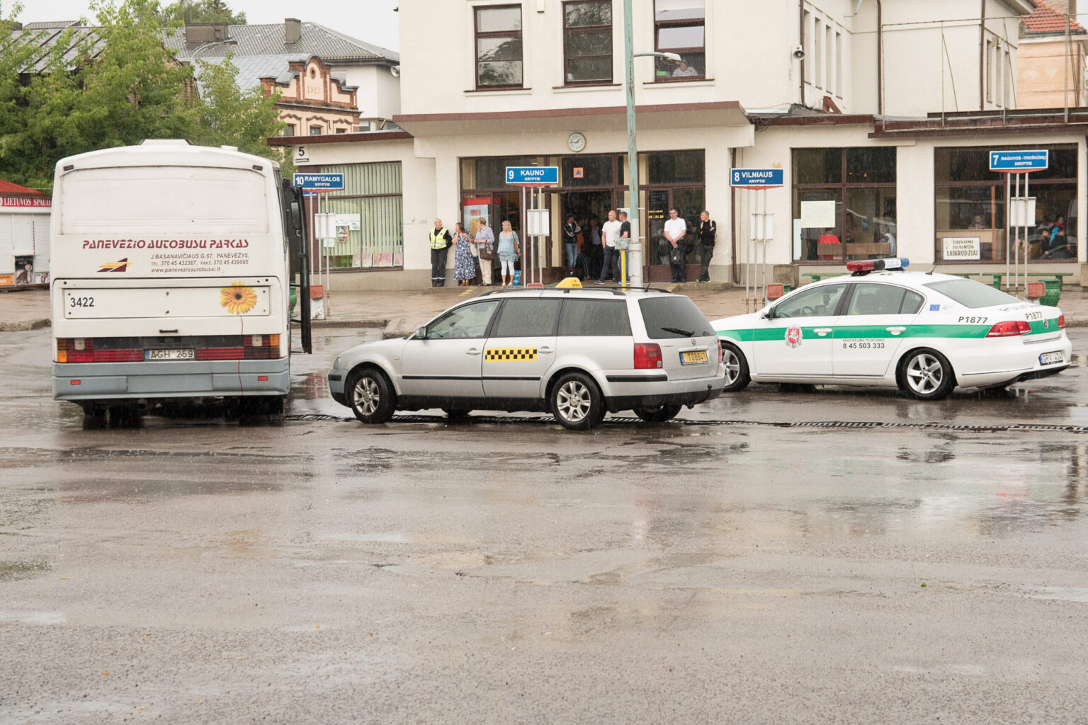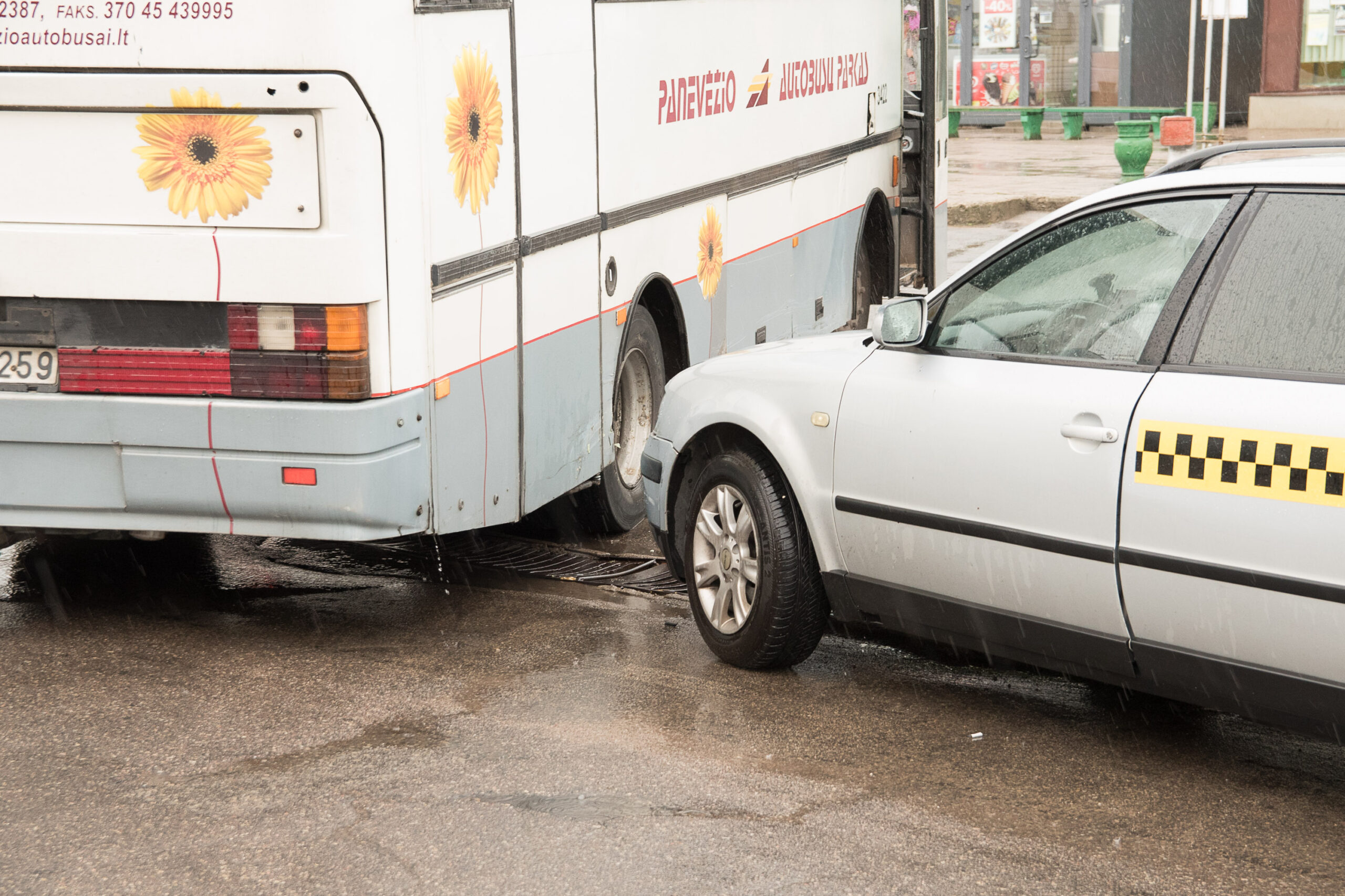 Panevėžio autobusų stotyje neišsiteko priemiestinis autobusas ir keleivį vežęs taksi automobilis.