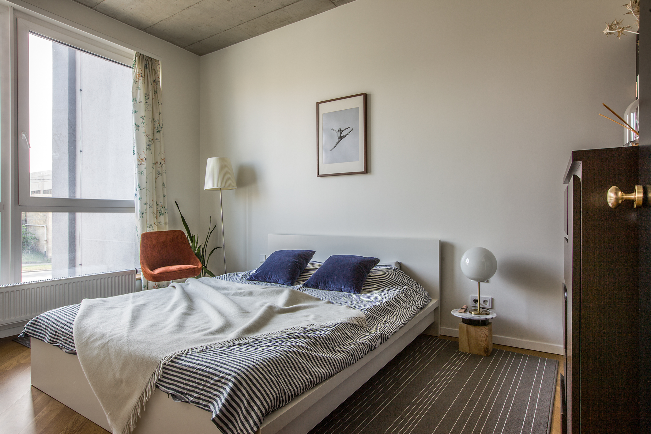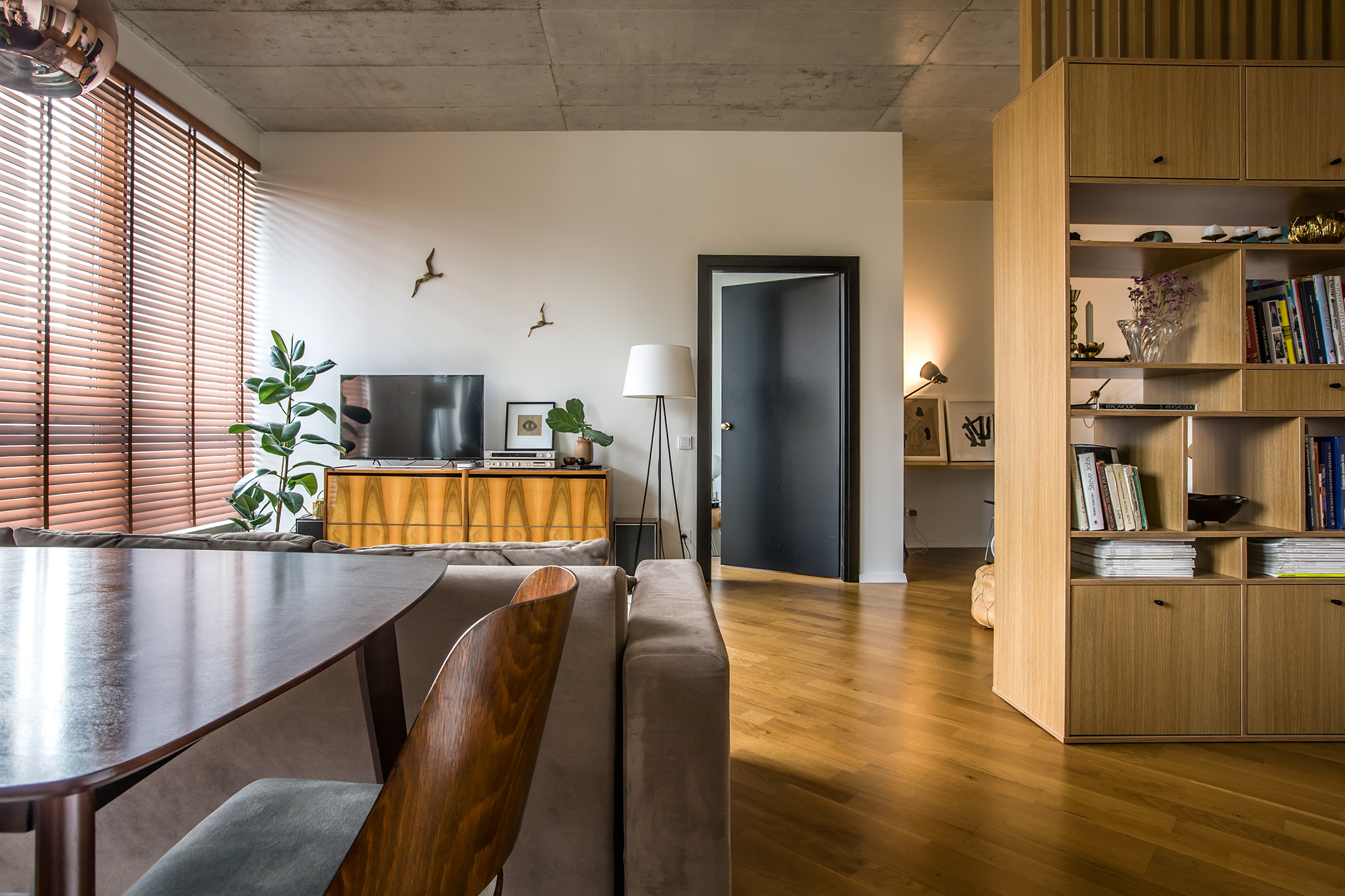 Namų kūrimo iššūkius ir atradimus sutuoktiniai nusprendė ne patikėti interjero dizaineriams, bet pasilikti sau – ir nei vieno, nei kito netrūko. Dabar dviejų kambarių būstas prieš įsikeliant buvo vientisa erdvė. Jauna pora pati braižė, skaičiavo, matavo, kiek ploto skirti miegamajam, kiek jo palikti drabužinei, kur įrengti darbo kampelį. Suplanavus funkcines zonas laukė naujas etapas, kuriame vėl teko braižyti ir skaičiuoti: patys būsto savininkai – abu grafikos dizaineriai – parengė virtuvės baldų komplekto, koridoriaus ir darbo kambarį skiriančios pertvaros-lentynos, kabamosios spintelės brėžinius, trokštamą veidrodžio formą, o visa tai pagamino vietos baldininkai.