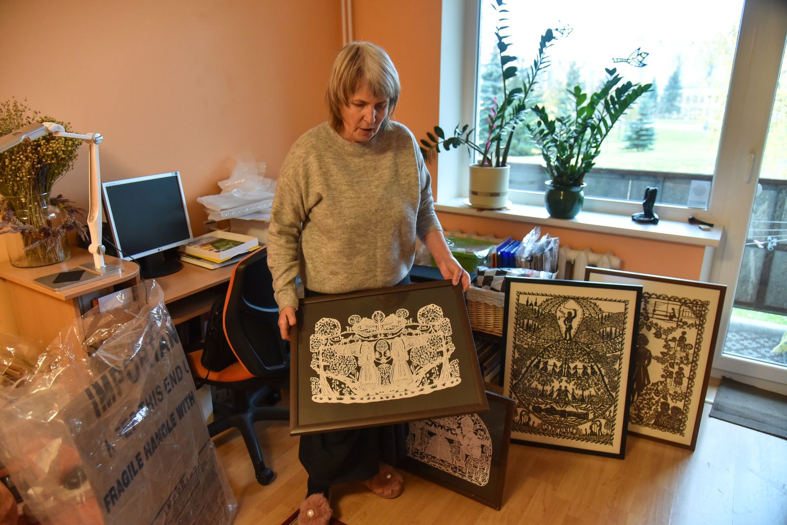 Į nedidelį butą Kupiškyje, kuriame vos telpa gausybė jos kurtų paveikslų, netrukus sugrįš ir dar beveik antra tiek įvairiose parodose eksponuojamų darbų.