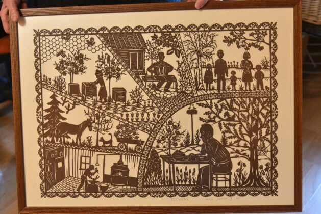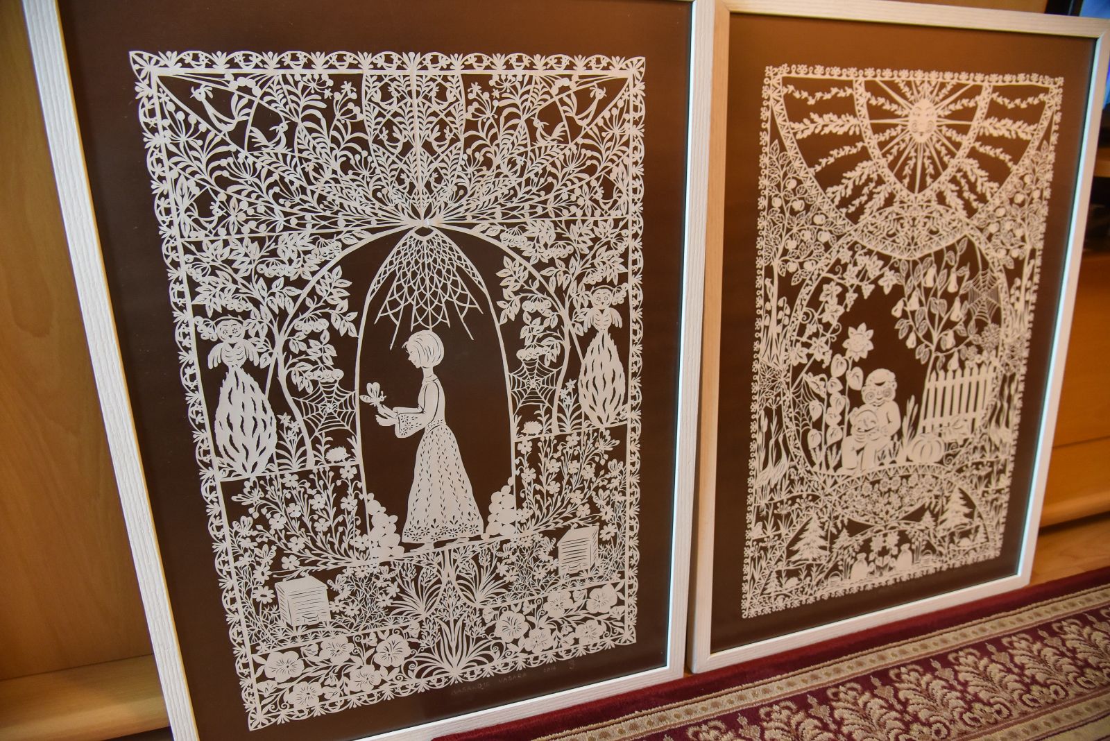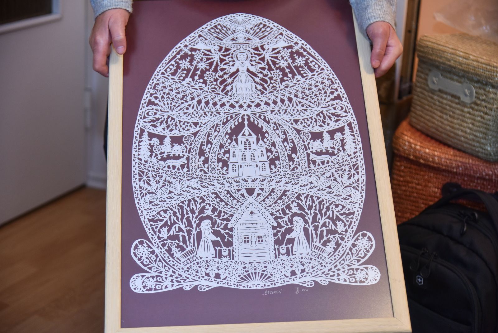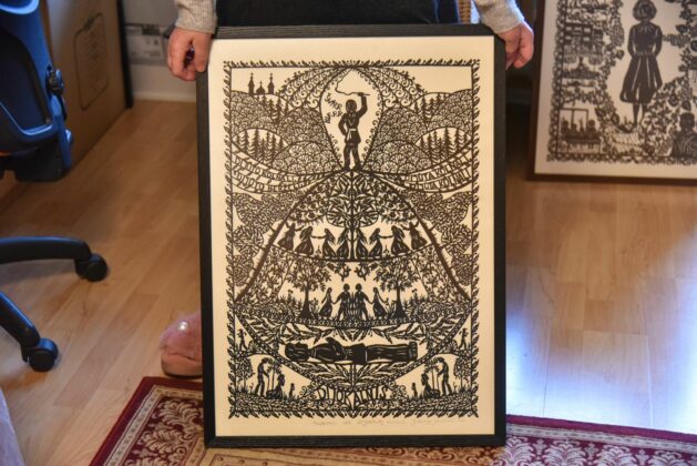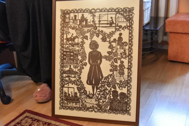 O jam skirtame paveiksle – visas gyvenimas. Kiek reikėjo meilės ir susikaupimo, kad paprastomis žirklutėmis paprastame popieriuje būtų išpasakoti visi mylimo žmogaus pomėgiai, šventės ir kasdienybė!