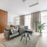 Šviesų būsto koloritą pabrėžia ir PVC grindų danga. D. Danilaitienė sako, kad ši aukštos kokybės medžiaga panaudota neatsitiktinai. „Tokios grindys pasirinktos dėl dviejų priežasčių: augintinio ir buto lokacijos. Kadangi tai – cokolinis aukštas, visi kambariai turi išėjimą į didelę, iš dalies apželdintą terasą lauke. Įbrėžimams ir drėgmei jautrus parketas būtų nuolatinis galvos skausmas“, – aiškina ji.