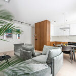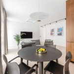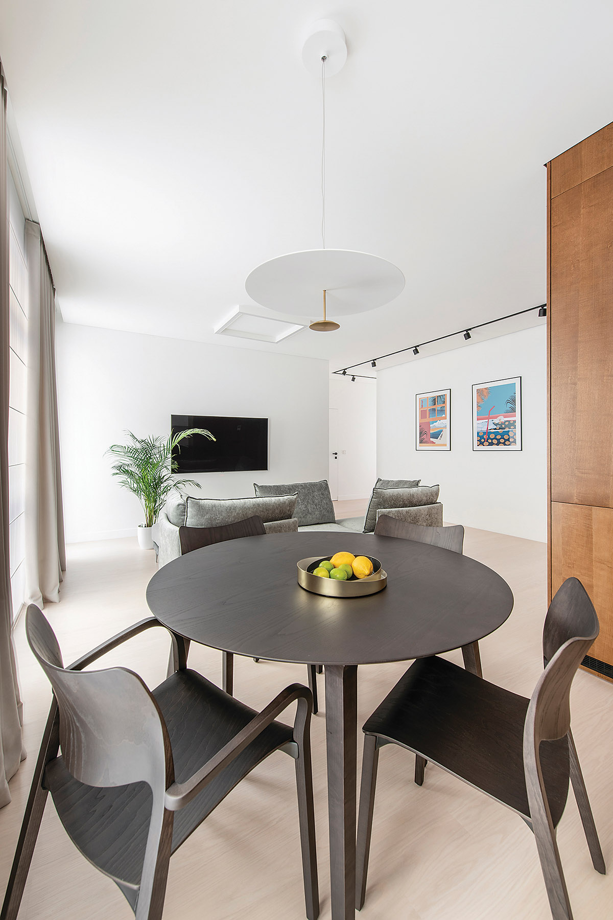 Paveikslai išveda bendrą virtuvės ir svetainės erdvę. Gana kompaktiška virtuvės zona, interjero kūrėjos teigimu, trijų žmonių šeimai yra komfortiška ir praktiška. Apvalus pietų stalas išsklaido bendros zonos kampuotumą ir tarnauja ne vien kasdieniams šeimos, bet ir svečių susibūrimams.