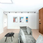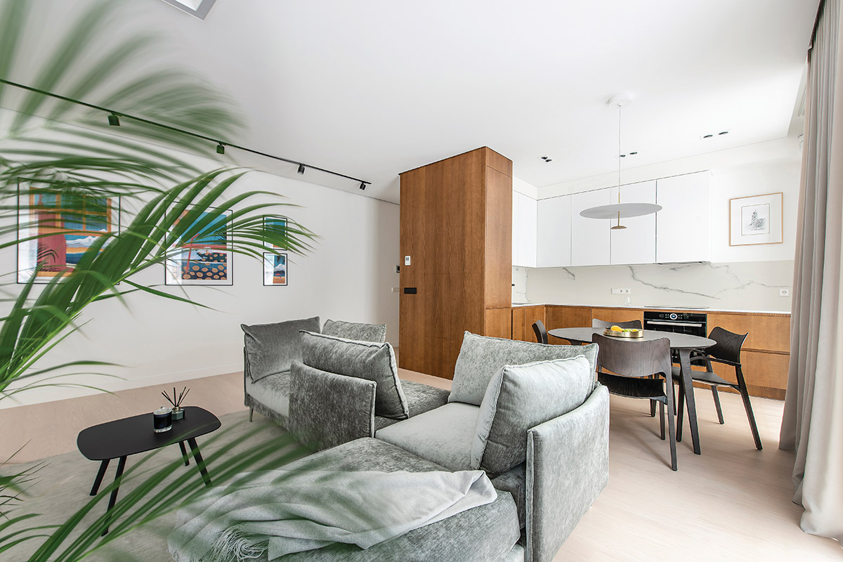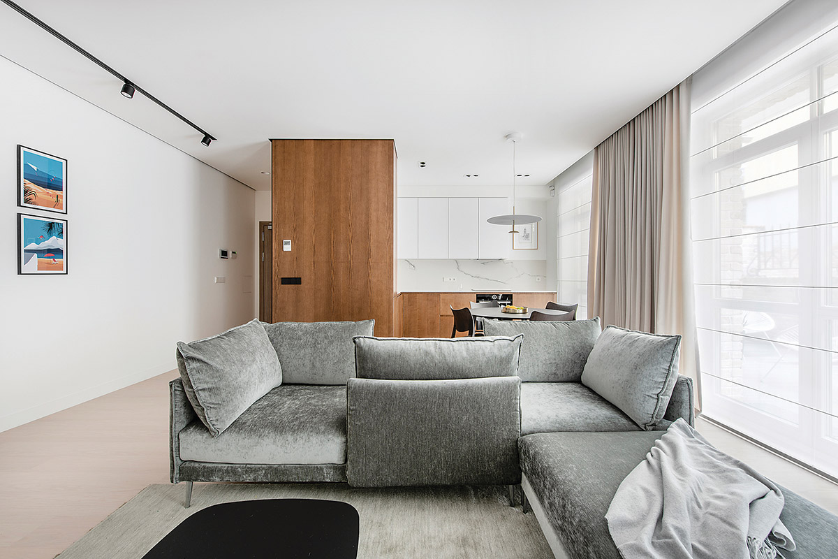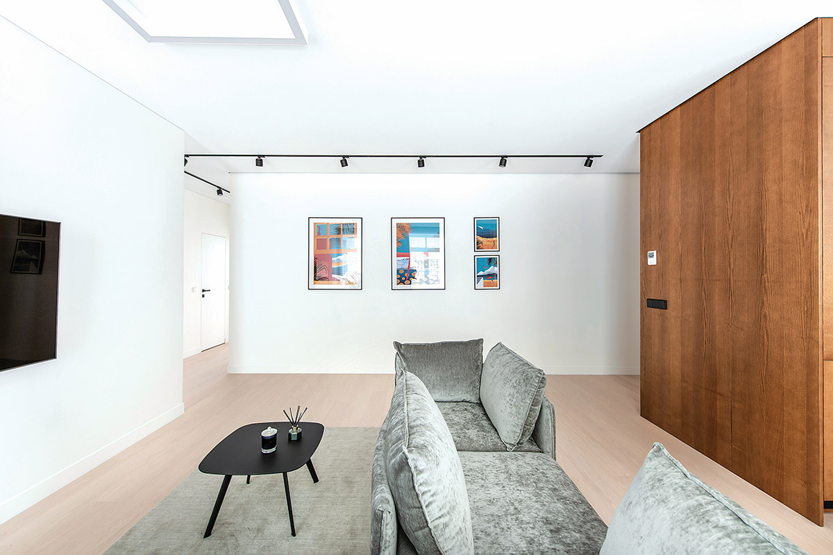 Į gyvenamąją erdvę iš prieškambario palydi pagal individualų užsakymą pagamintos ryškiaspalvės iliustracijos. „Visas buto interjeras yra ramus ir santūrus, tačiau užsakovai – linksmi, mėgstantys aktyvų laisvalaikį bei daug keliaujantys žmonės. Iliustracijas sieja bendra tematika – kelionės, sportas, kuriuos menininkas pavaizdavo įdomesniu rakursu, per surrrealizmo prizmę“, – sako D. Danilaitienė.