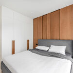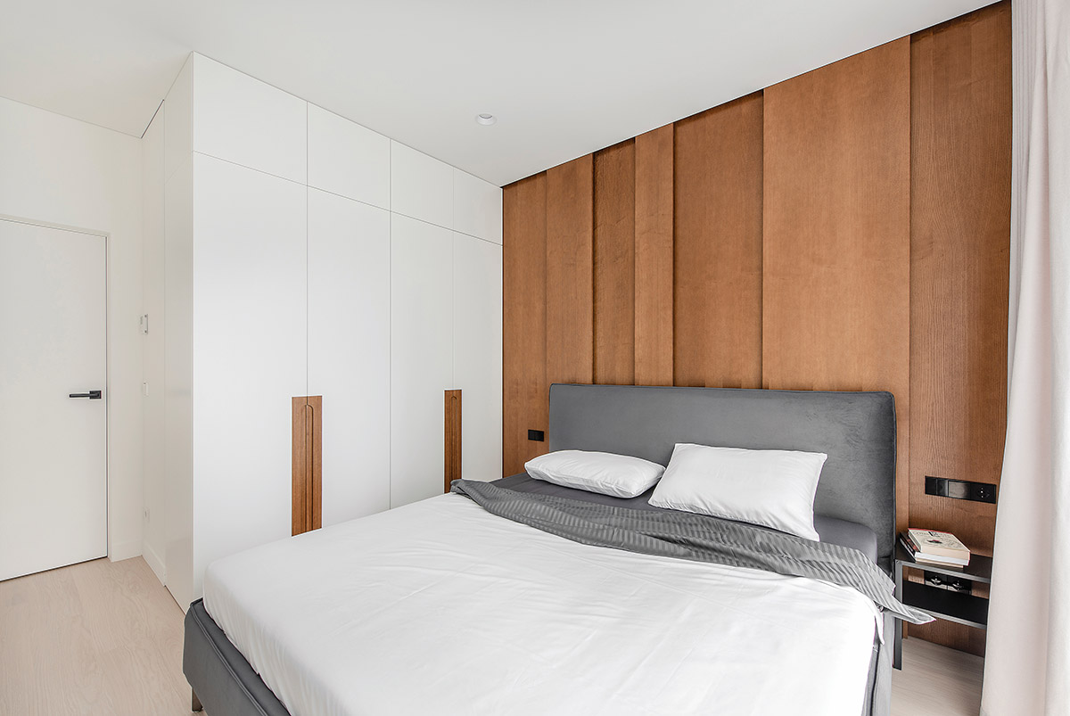 Nedideliame šeimininkų miegamajame į akis krenta natūralaus beicuoto uosio lukšto siena, suteikianti intymumo ir solidumo. Po plokštėmis paslėpti LED šviestuvai atrodo dekoratyviai ir skleidžia šviesą vakarais. Dizainerės teigimu, jų visiškai pakanka ir skaityti.
