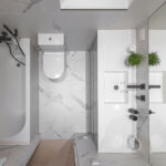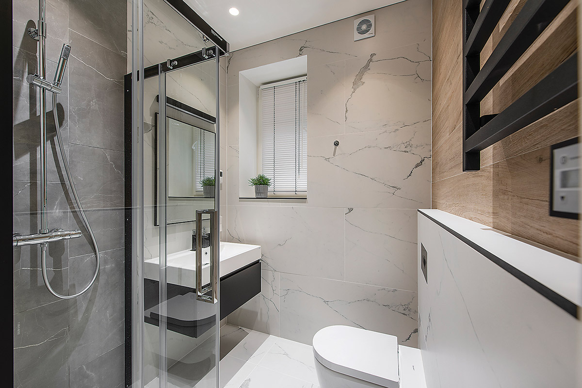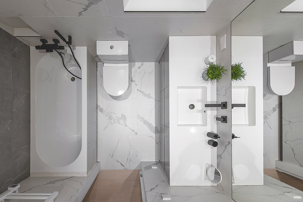 Dviejų miegamųjų buto šeimininkai turi po atskirus vonios kambarius – jam ir jai. Vyriškajame įrengtas tualetas, dušas, pastatyta antracito spalvos spintelė. Šeimininkės kambaryje telpa vonia, ant sienos kabo didelis veidrodis. Čia įrengtas talpus erdvesnis baldas, kuriame integruota skalbimo mašina su džiovykle. Abu kambariai šiek tiek skiriasi, tačiau turi bendrą stilistinį elementą – marmuro rašto plyteles.