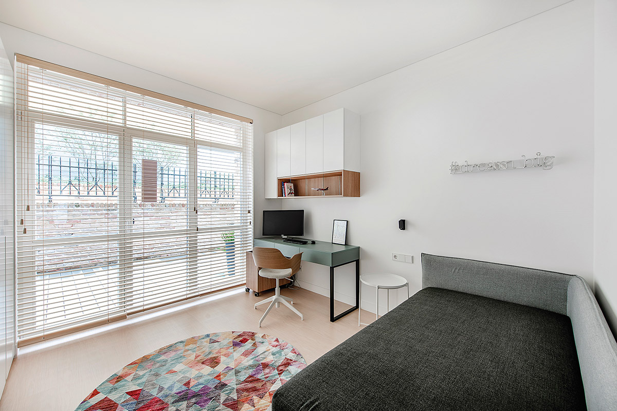 Kuriant interjerą daug dėmesio skirta į pirmą klasę einančios šeimos atžalos kambariui. „Siekėme, kad kambarys neatrodytų vaikiškai, jo interjeras, baldai tarnautų ilgus mokslo metus ir jo nereikėtų greitai atnaujinti, taikantis prie augančio paauglio. Tai universalus kambarys, kuriame vyrauja ramūs, švarūs atspalviai. Medžio akcentai balduose ir medinės žaliuzės suteikia jaukumo“, – sako D. Danilaitienė.
