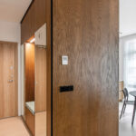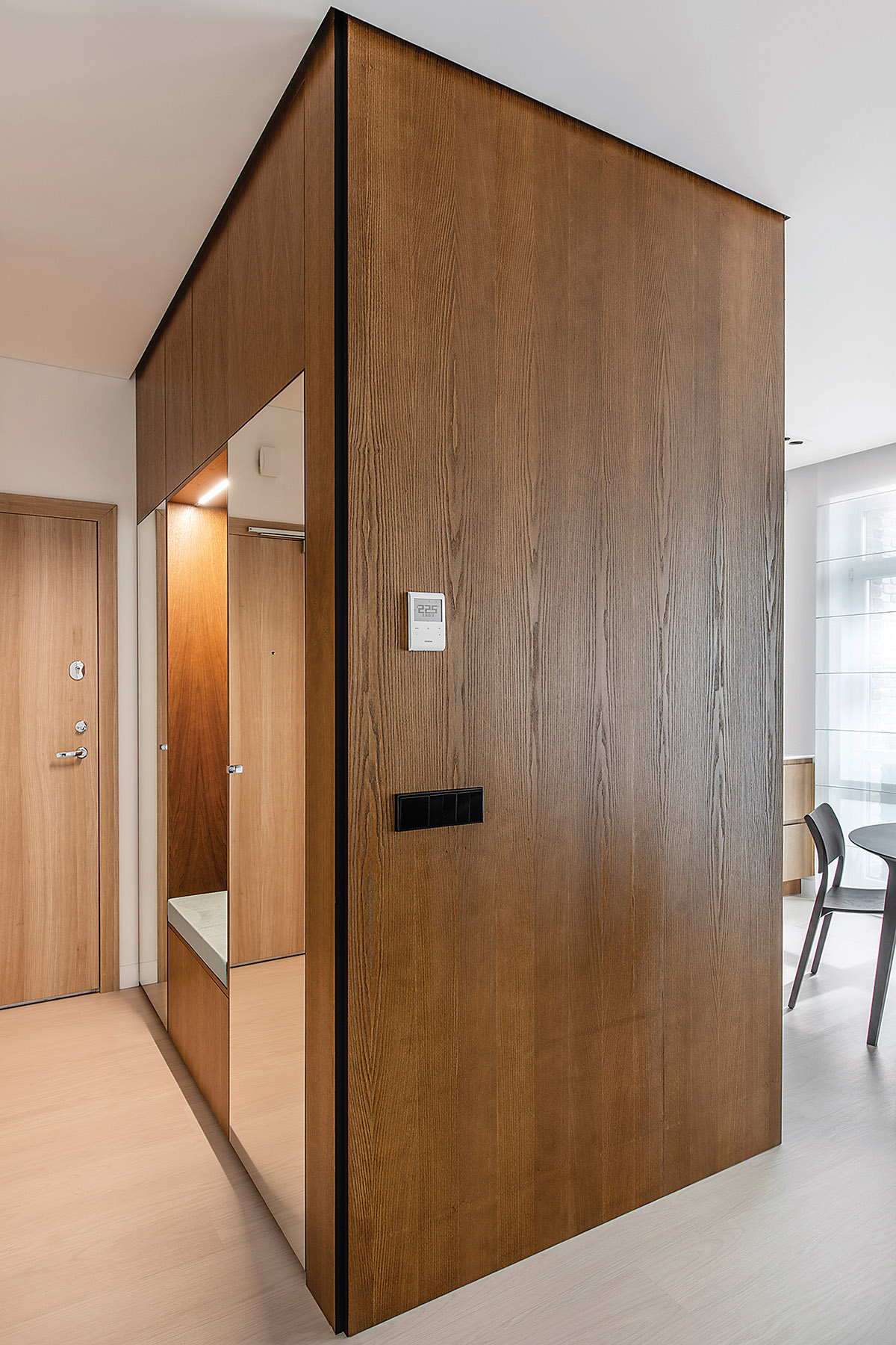 D. Danilaitienė pasakoja, kad visi baldai buvo projektuojami kruopščiai apgalvojus jų funkcionalumą. Iš natūralaus beicuoto uosio lukšto plokštės sukonstruotas baldas jungia prieškambario spintą ir virtuvės baldus. Be pagrindinės paskirties – sudėti kasdieniniams viršutiniams drabužiams ir avalynei, jis tarnauja kaip patogus suoliukas, ant kurio galima prisėsti maunantis batus.