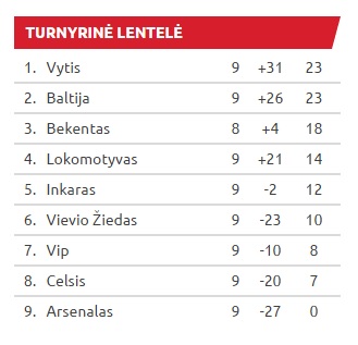 „Baltija“ triumfavo 6:1 ir dabar turnyro lentelėje turi surinkę 23 taškus – tiek pat, kiek pirmoje vietoje žengiantis Kauno „Vytis“. Tiesa, kauniečiai yra aukščiau dėl daugiau įmuštų įvarčių. Tuo tarpu „Arsenalas“ lieka vienintelė komanda lygoje, kuri neiškovojo nė vieno taško.