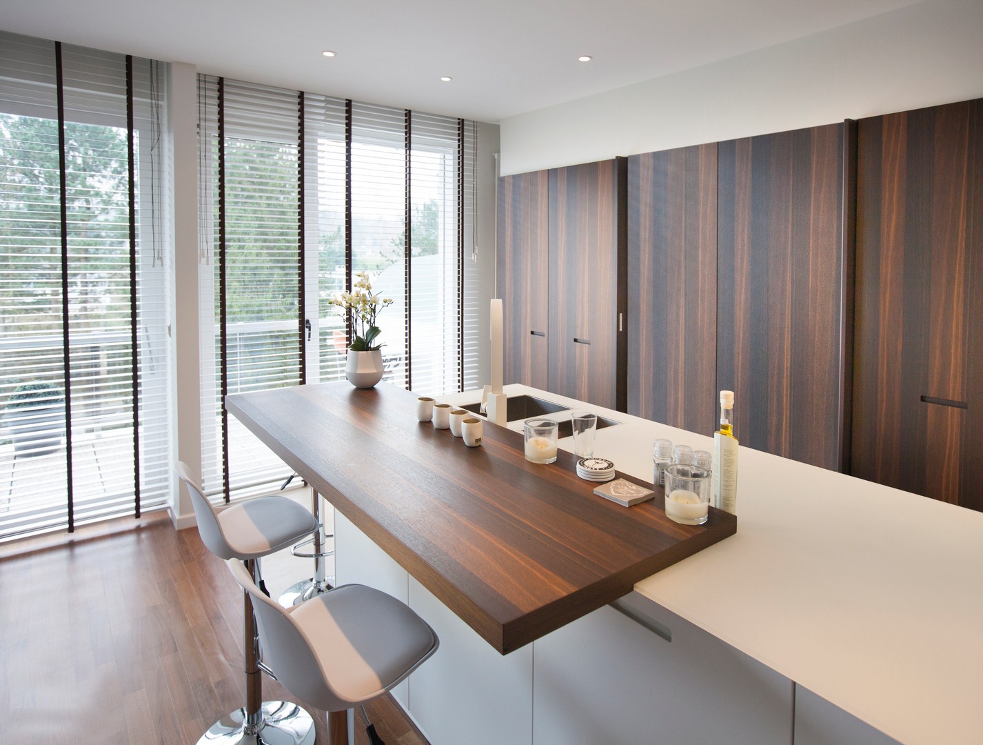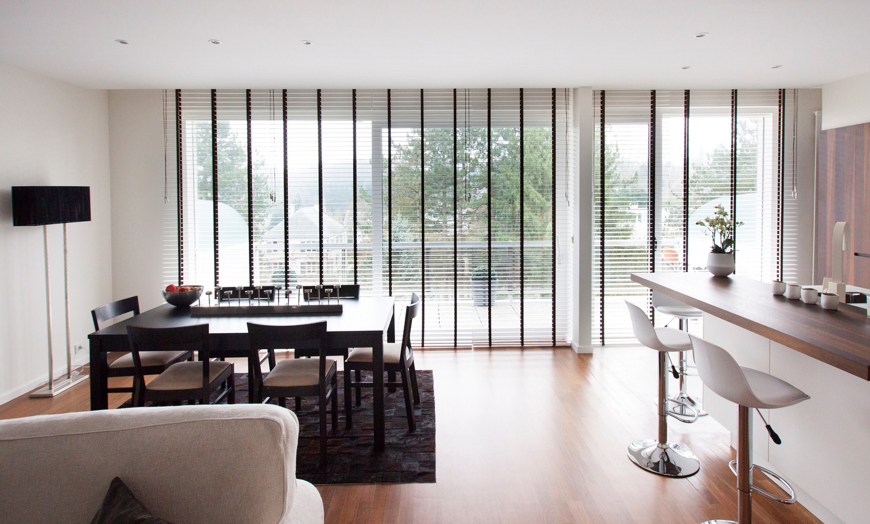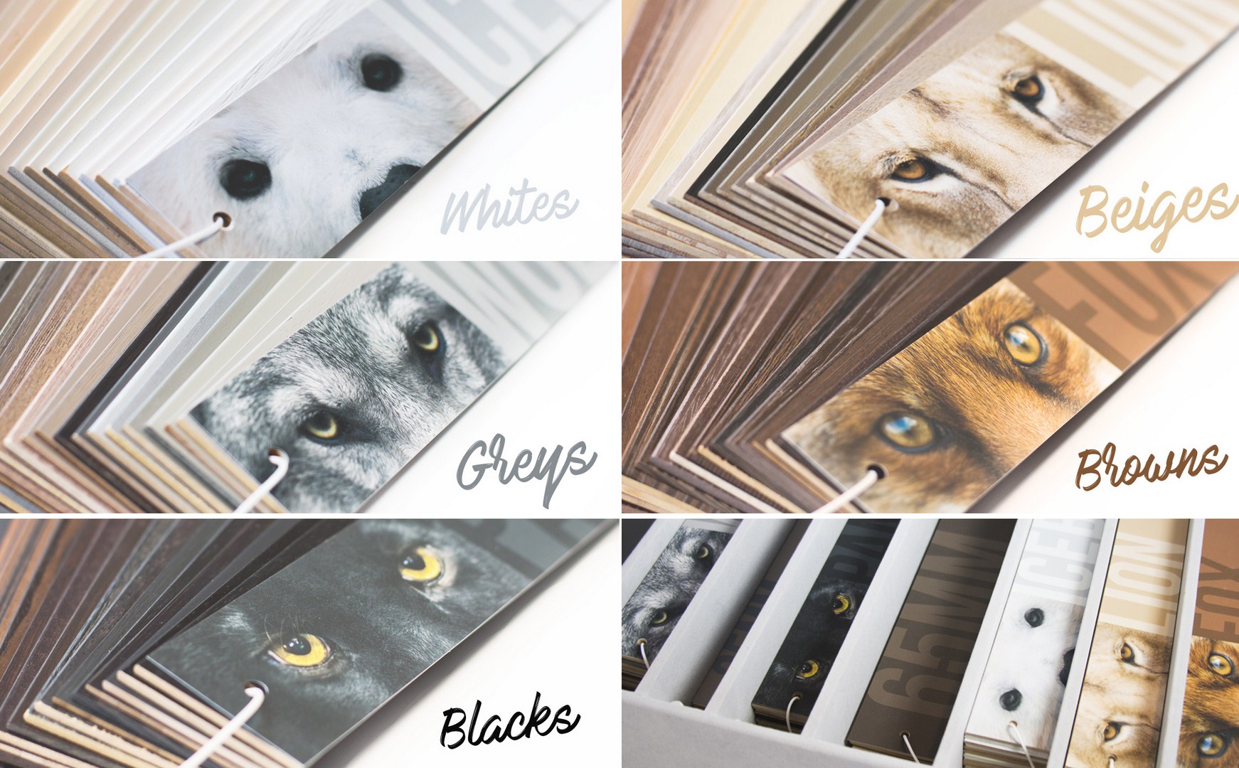 Baltos, pilkos, rusvos spalvos ir skirtingos struktūros paviršiaus paletes paprasta priderinti prie langų, durų, kitų paviršių. 35, 50, 65 mm storio medinės juostelės – nestandartinis požiūris: didesnis plotis padeda geriau atsiskleisti medžio grožiui, jį pateikti kaip darniai į aplinką įsiliejantį akcentą. Panorėjus daugiau dekoratyvumo, galima naudoti siauresnes ar platesnes tekstilines kopetėles, kurios skirtingai nuo įprastų laikomųjų juostų, dailiai papildo žaliuzių vaizdą.
