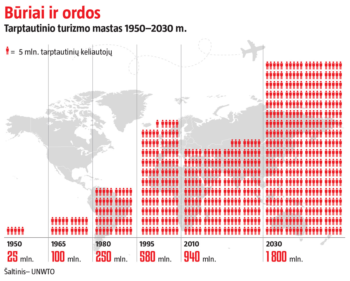 Spartus turizmo augimas nėra naujas reiškinys. Nuo 1950 iki 2000 m. visame pasaulyje keliaujančiųjų skaičius išaugo daugiau nei 20 kartų – nuo 25 mln. iki 580 mln. Iki 2010 m. šis skaičius dar beveik padvigubėjo. Prognozuojama, kad iki 2030 m. keliaujančiųjų bus jau 1,8 mlrd.