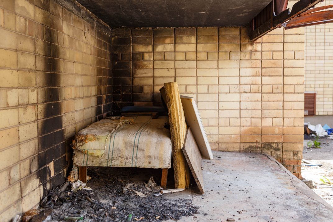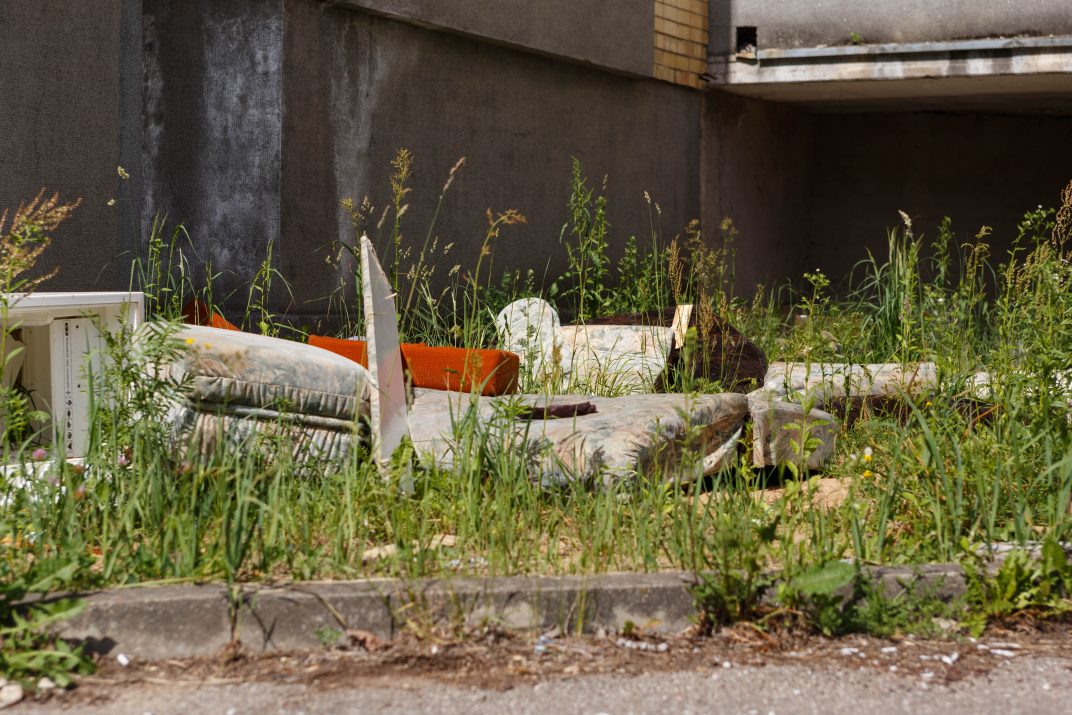 Po vienu iš balkonų patiestas čiužinys, nuo smalsių akių pridengtas lentgaliais. Kad ant jo yra miegama, išduoda šalia paliktos moteriškos šlepetės. Įspūdį, tarsi būtum atsidūręs siaubo filmo filmavimo aikštelėje, sustiprina kiečiais ir aukšta žole apaugusi teritorija – metalo vagys išlupo net nuotekų šulinių dangčius, kurie dabar uždangstyti senomis padangomis ar faneros lakštais.